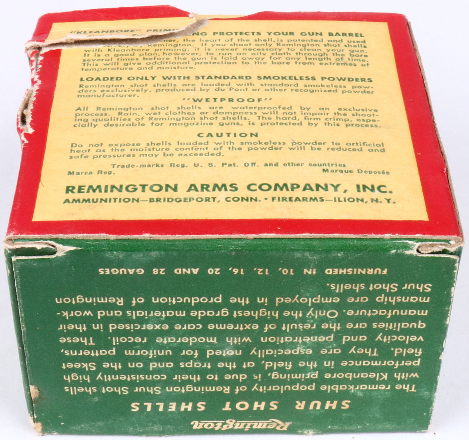 Remington, Shur Shot, 16ga., 2 9/16'', 1pc., Full, shot size 6, box is red, white and green, box has shell protrusions & tears with great colors, shells are excellent. Grade: Excellent - Value: 10 to 30