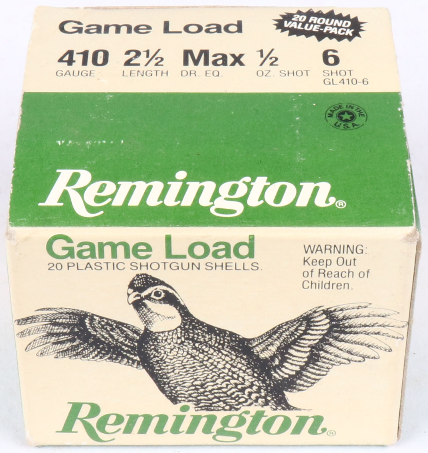 Remington, Game Load, 410ga., 1pc., Full, shot size 6, multi-colored box, shells are excellent. Grade: Excellent - Value: 8 to 20