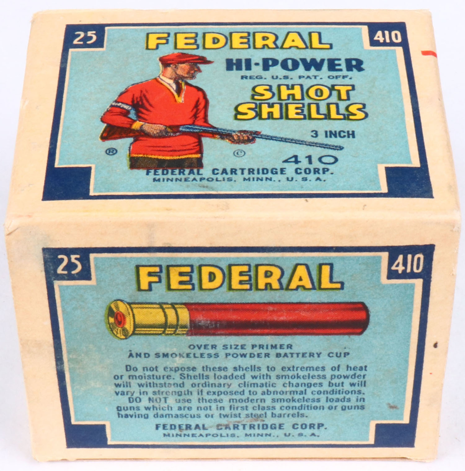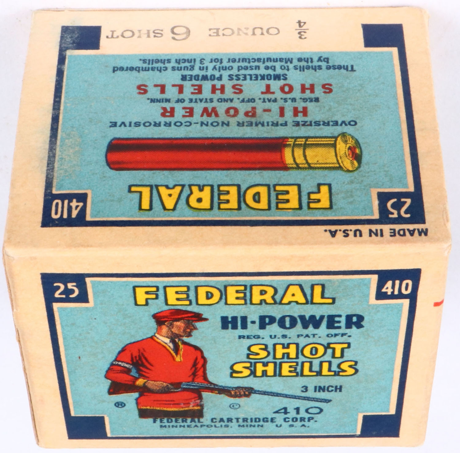 Federal Cart. Co., HI-POWER, 410ga., 1pc., Full, shot size 6, Blue border, blue, yellow and red box with trap shooter, box is very solid with great color, shells are very good. Grade: Excellent - Value: 20 to 60