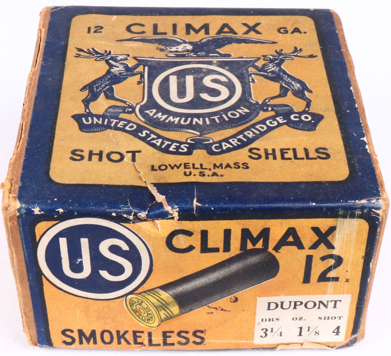 US Cart. Co., Lowell, Mass, Climax, 12ga, 2pc., Empty, shot size 4, buff box orange, blue & white label, box has age soiling, seam splits, light edge wear & puncture on top of box with very nice colors. Grade: Very Good + - Value: 20 to 100