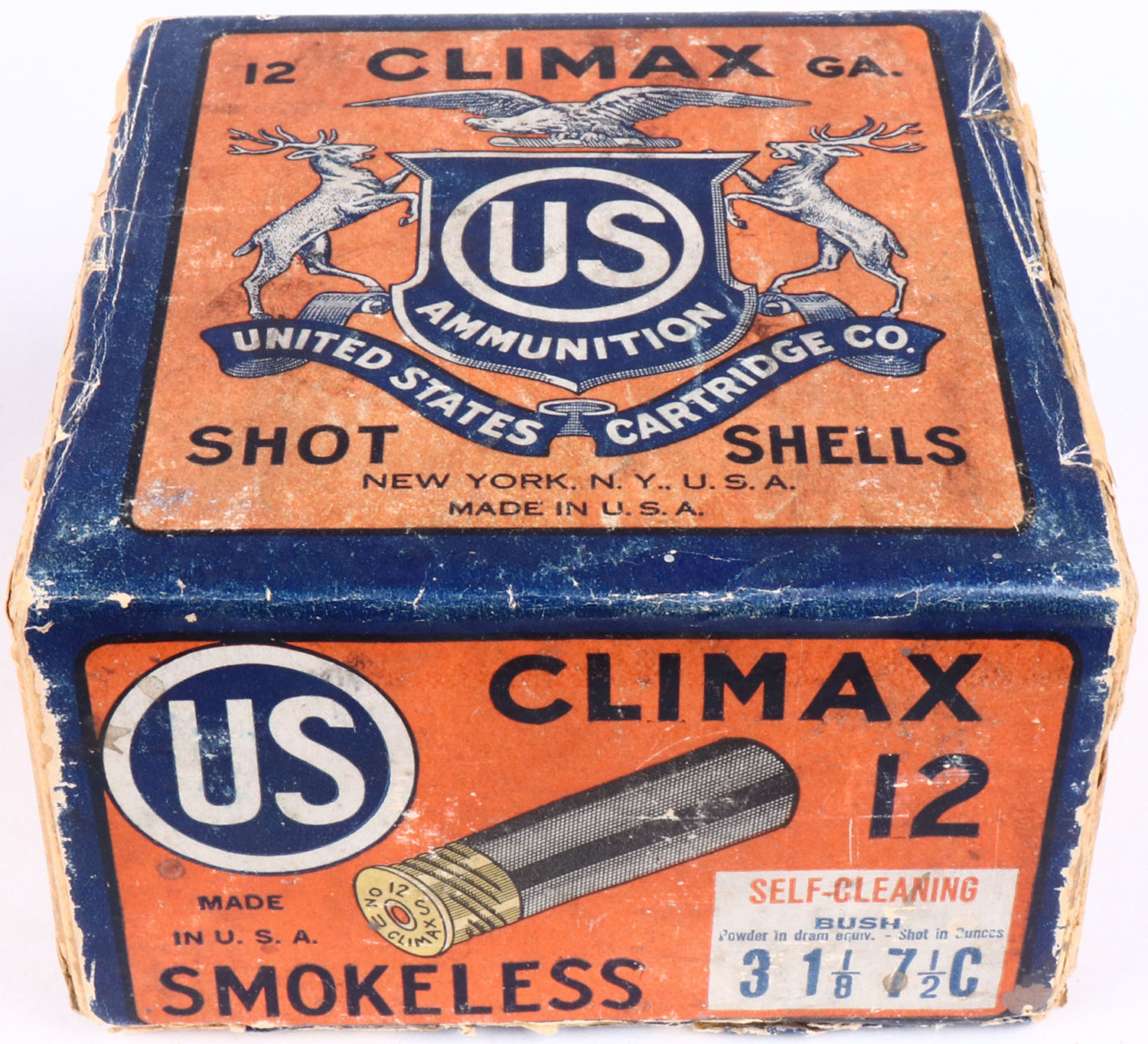 US Cart. Co., New York, N.Y, Climax, 12ga, 2pc., Partial 13rds., shot size 7 1/2C, buff box orange, blue & white label, box has light age soiling, tape repair & edge wear with very nice colors. Grade: Very Good ++ - Value: 40 to 120