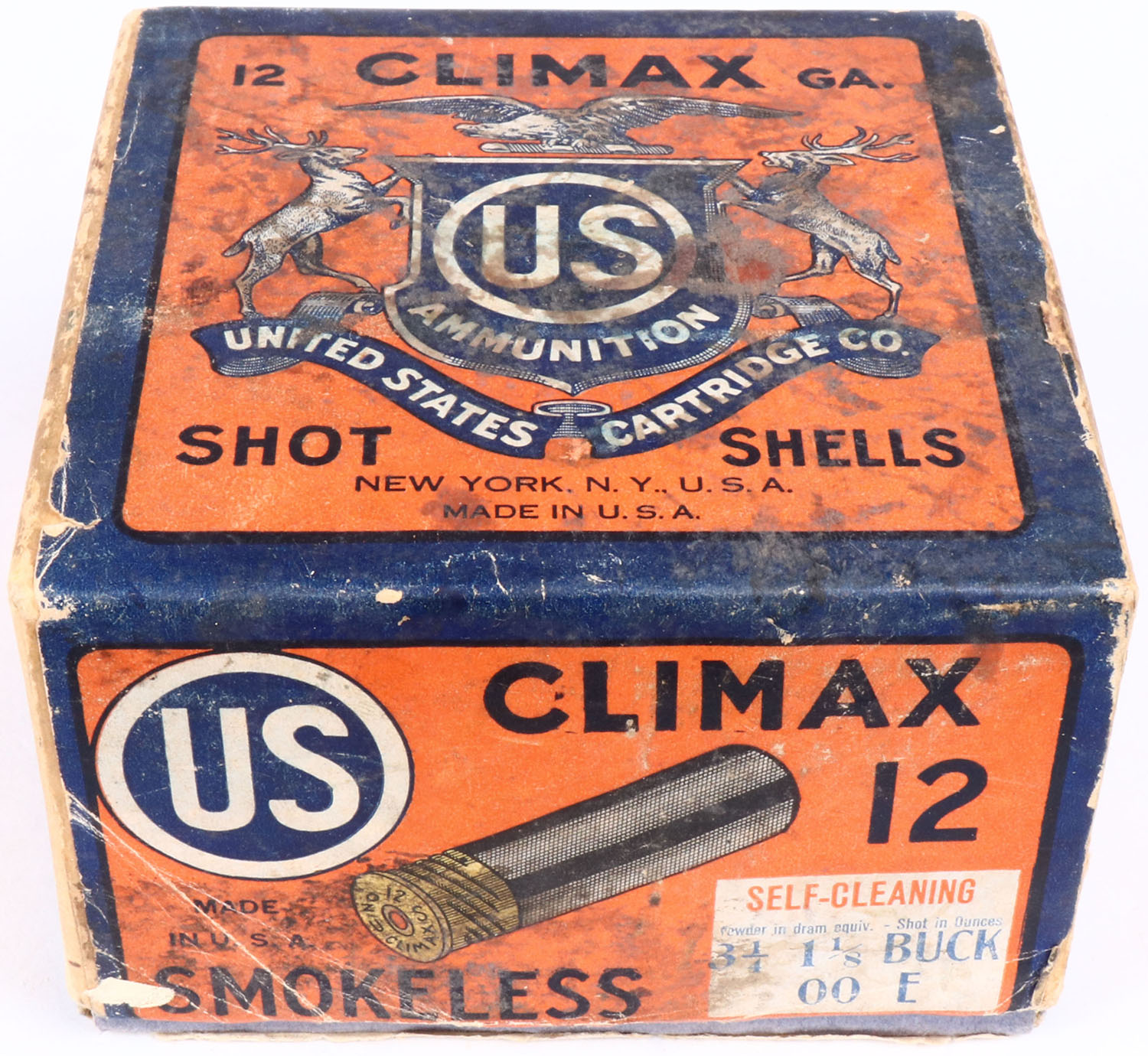 US Cart. Co., New York, N.Y, Climax, 12ga, 2pc., Empty, shot size 00 Buck, buff box orange, blue & white label, box has age soiling, incorrect bottom, seam splits & edge wear with nice colors. Grade: Very Good + - Value: 20 to 100