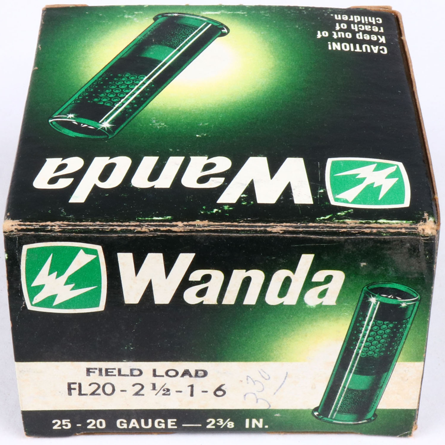 Wanda, 20ga., 1pc., Partial 24rds., shot size 6, box is solid, Shells are excellent. Grade: Excellent + - Value: 8 to 20