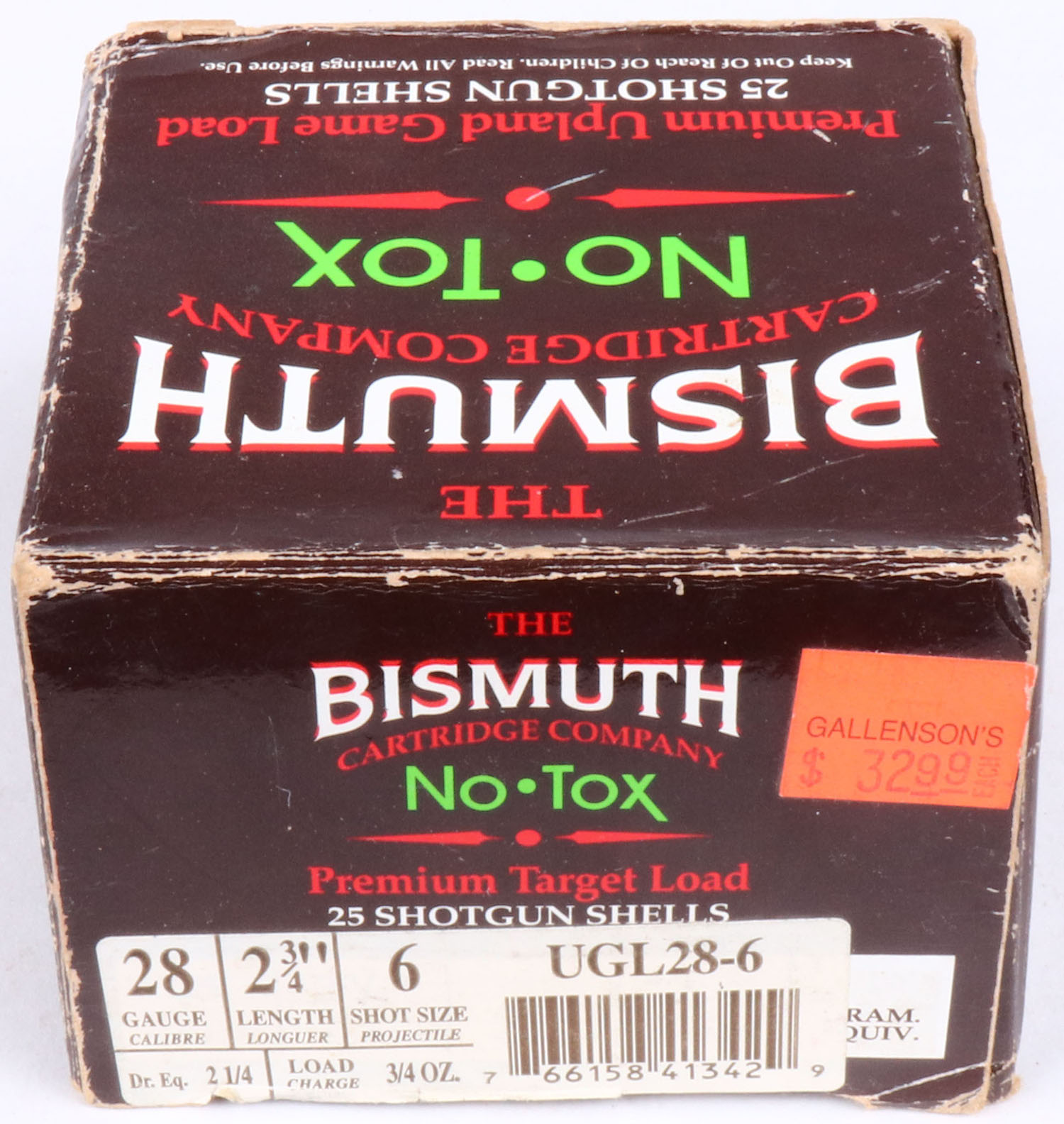 Bismuth, 28ga., 1pc., Full, shot size 6, box is solid, Shells are excellent. Grade: Excellent + - Value: 8 to 20