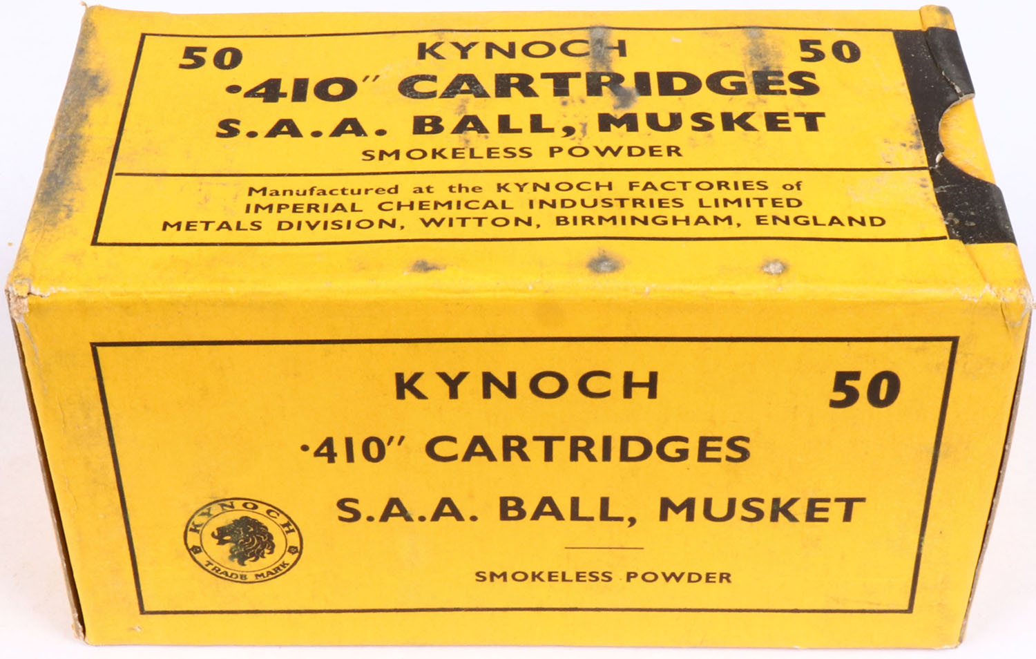 Kynoch, 410ga., 1pc., Full, shot size S.A.A. Ball Musket, multi-colored box, box is solid, shells are excellent. Grade: Very Good ++ - Value: 8 to 20