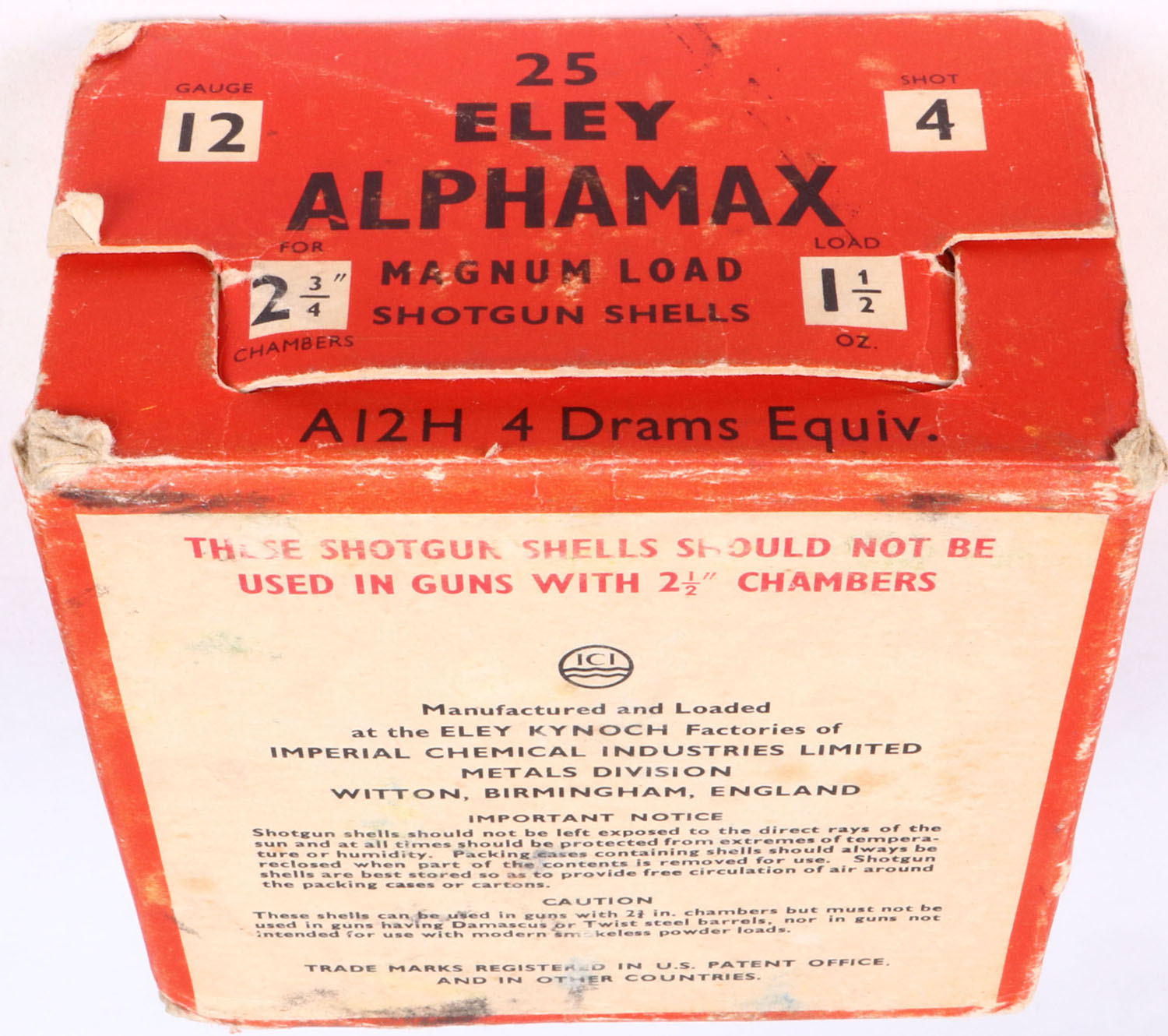 Eley, Alphamax, 12ga., 1pc., Partial 21rds., shot size 4, multi-colored box, box has seam split, Shells are excellent. Grade: Excellent + - Value: 8 to 20