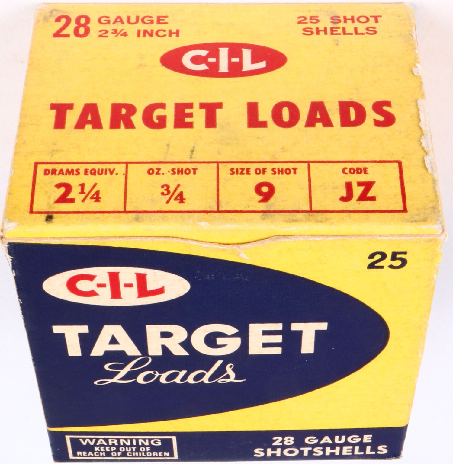 C-I-L, Target Loads, 28ga., 1pc., Full, shot size 9, multi-colored box, box is very solid, Shells are excellent. Grade: Excellent + - Value: 8 to 20
