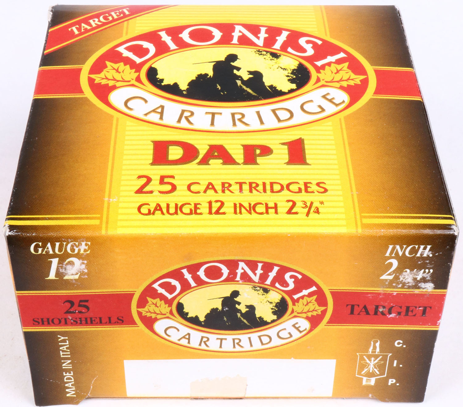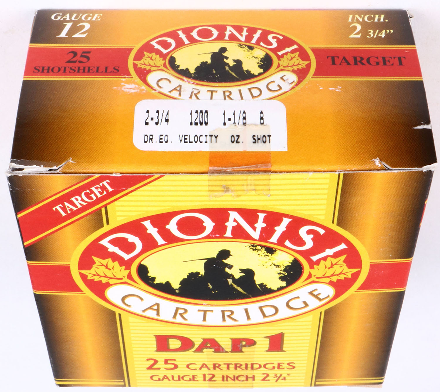 Dionis, 12ga., 1pc., Full, shot size 8, multi-colored box, box is very solid, Shells are excellent. Grade: Excellent + - Value: 8 to 20