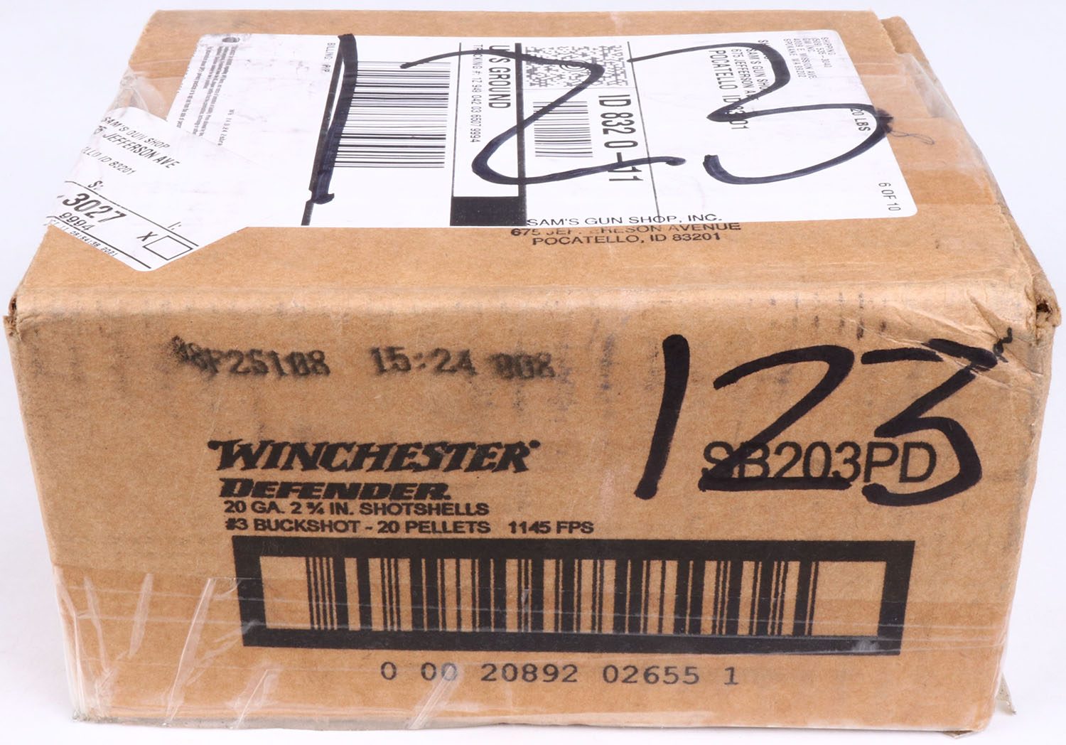 Winchester, Defender, 20ga., 1pc., FULL & SEALED case of 10 boxes, 100rds, shot size 3 Buck, box is very solid. Grade: Excellent + - Value: 50 to 300