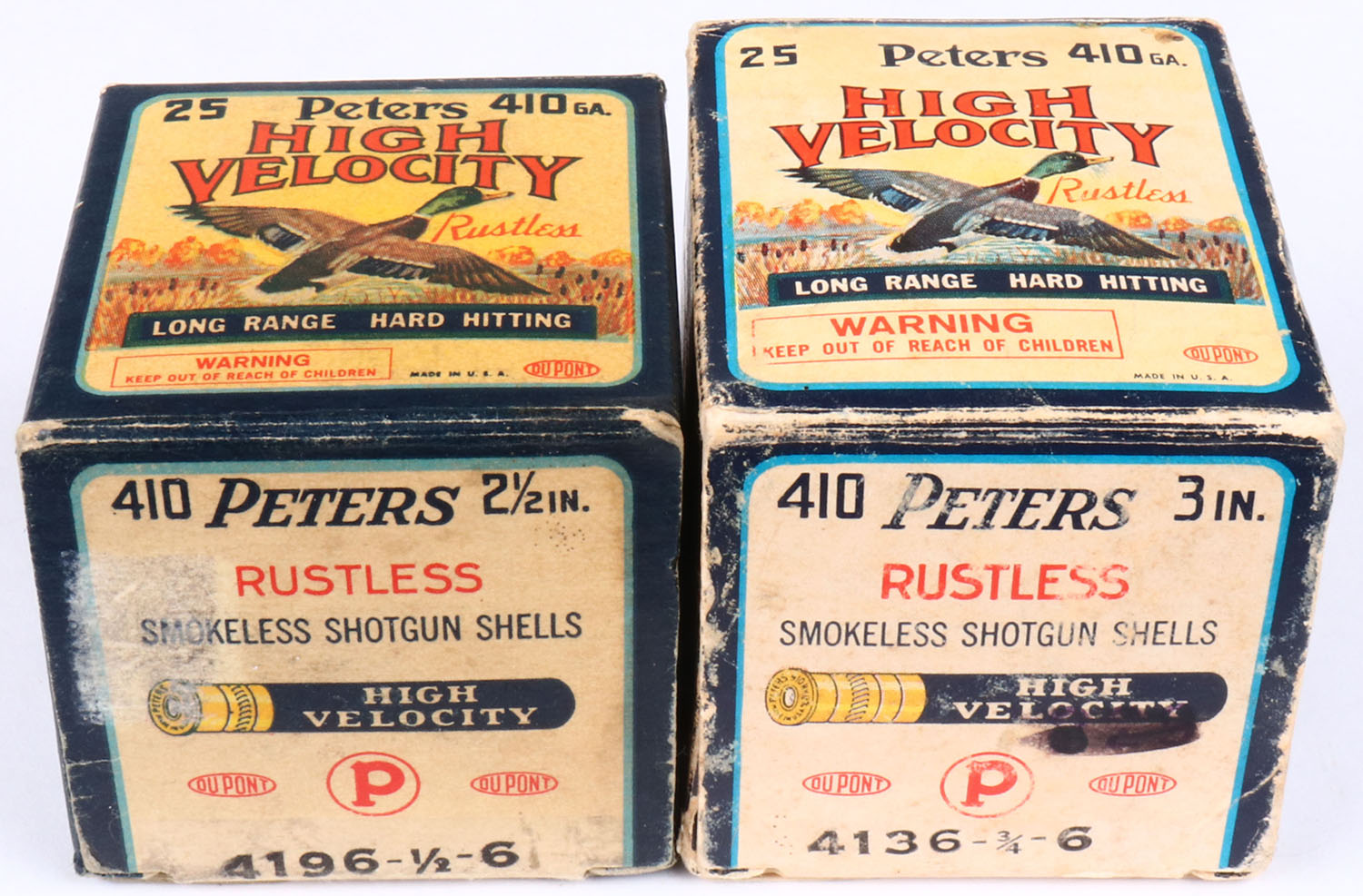 Lot of 2 Peters, High Velocity, 410ga., 1pc., Partial, 2 1/2'' & 3'', shot size 6, multi-colored box, shells are very good. Grade: Excellent - Value: 8 to 20