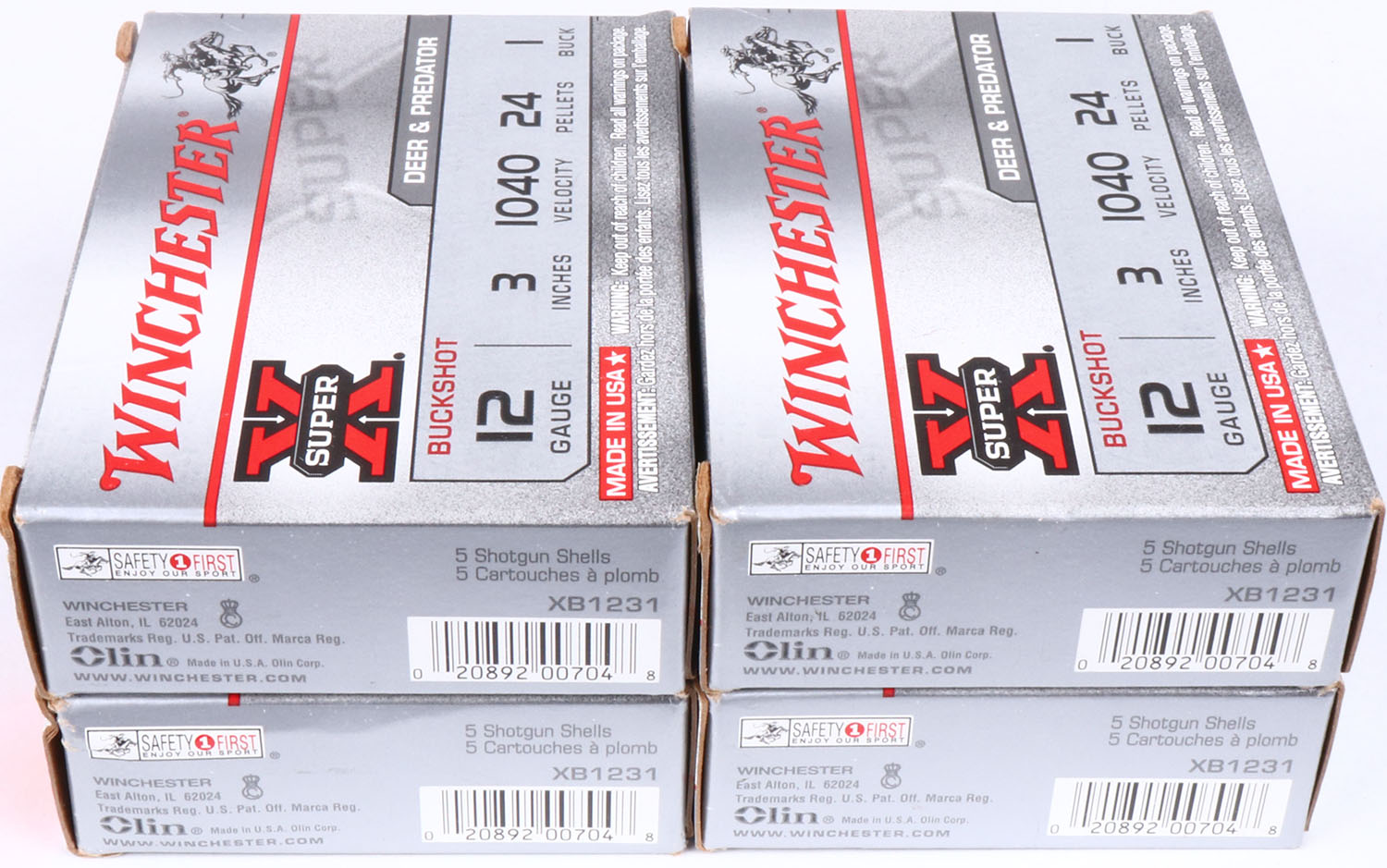 Lot of 4 Winchester, Super X, 12ga., 1pc., Full, 3'', shot size 1 Buck, multi-colored box, shells are very good. Grade: Excellent - Value: 8 to 20