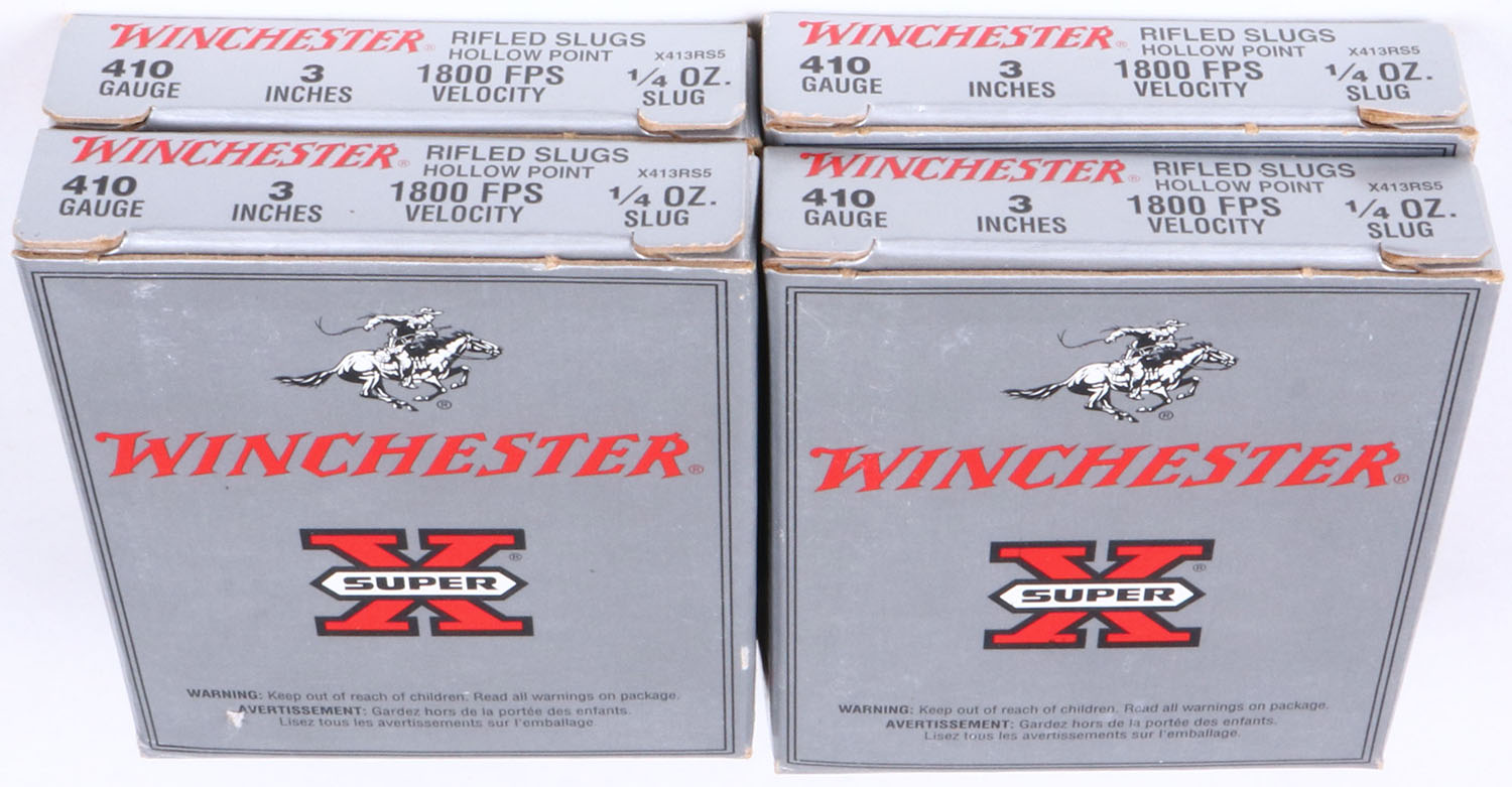 Lot of 4 Winchester, Super X, 410ga., 1pc., Full, 3'', shot size Rifled Slug Hollow Point, multi-colored box, shells are very good. Grade: Excellent - Value: 8 to 20