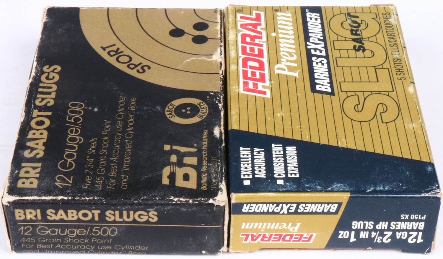 Lot of 2 BRI/Federal, 12ga., 1pc., Full, 2 3/4'', shot size Sabot Slugs, multi-colored box, shells are very good. Grade: Excellent - Value: 8 to 20