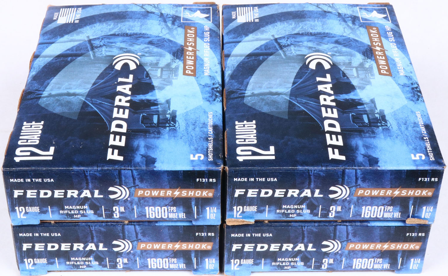 Lot of 4 Federal, 12ga., 1pc., Full, 3'', shot size Magnum Rifled Slug, multi-colored box, shells are very good. Grade: Excellent - Value: 8 to 20