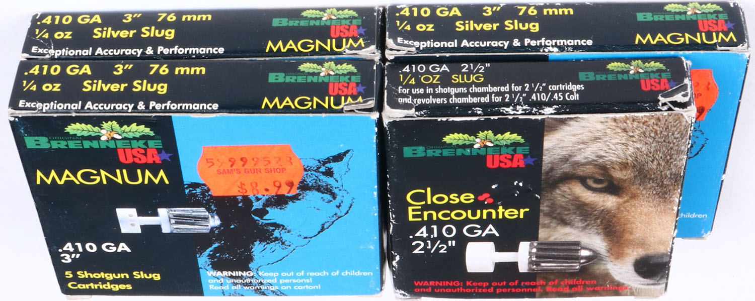 Lot of 4 Brenneke USA, 410ga., 1pc., Full, 3'' & 2 1/2'', shot size Slug, multi-colored box, shells are very good. Grade: Excellent - Value: 8 to 20