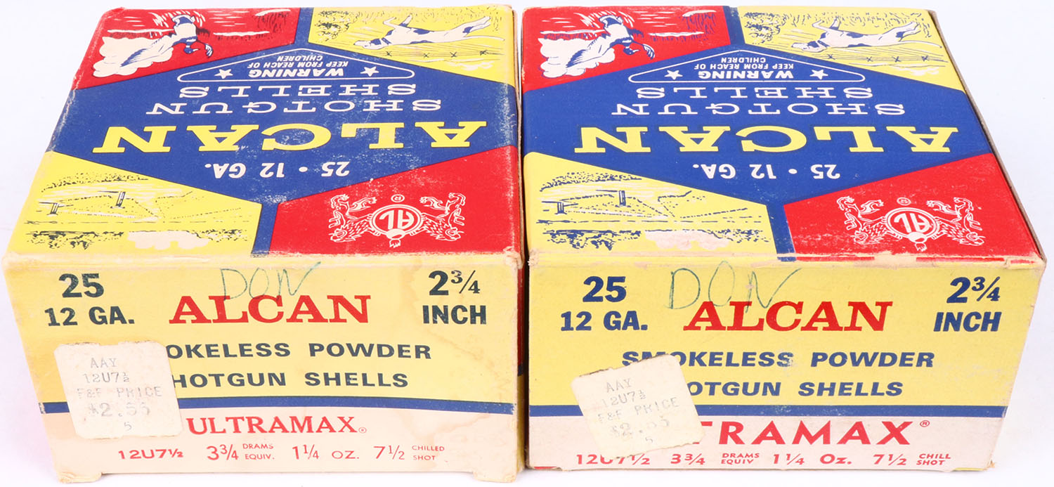 Lot of 2 Alcan, 12ga., 1pc., Full, 2 3/4'', shot size 7 1/2 Chilled, multi-colored box, shells are very good. Grade: Excellent - Value: 8 to 20