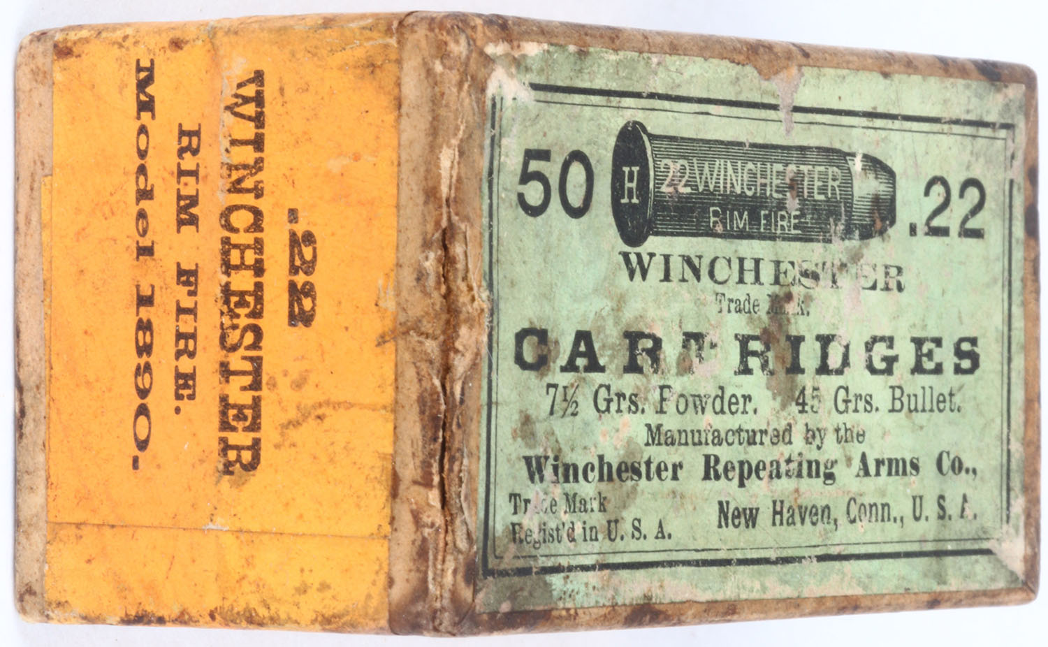 Winchester, .22 Winchester Rim Fire, RR: WRA-149 WRF-3a, FULL & SEALED, 2pc. Buff box with green top & orange side sealing labels, box is solid with very good color, age soiling, staining, partial seam split on top left edge, edges are otherwise crisp, very minor corner wear, labels are intact. Grade: Very Good ++ - Value: 100 to 300