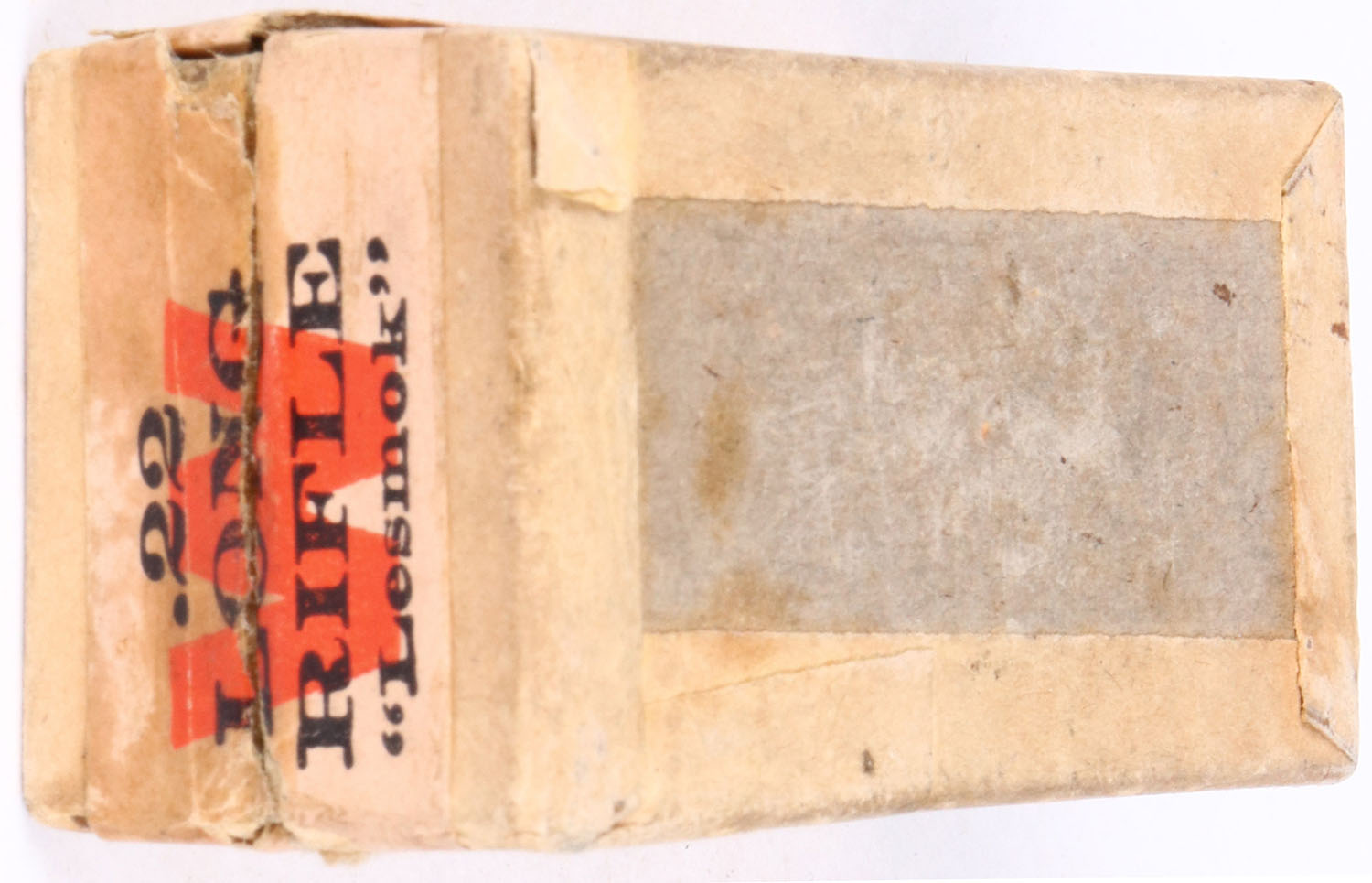 Winchester, ''Lesmok'' Rifle Cartridges, .22 Long Rifle, LR-26b, Full, 2pc. Buff box with green top & buff side sealing labels, box is solid with excellent color, very minor age soiling & shelf wear, very minor edge & corner wear, labels are intact, ammo is very good. Grade: Excellent + - Value: 30 to 90