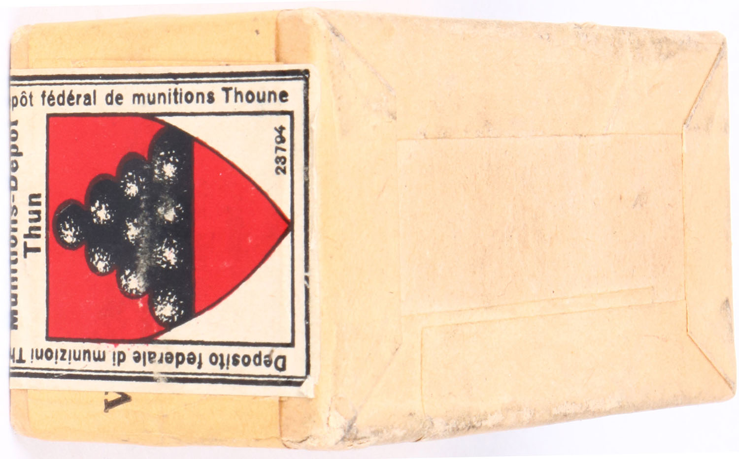 Winchester, ''Lesmok'' Rifle Cartridges, .22 Winchester Rim Fire, RR: WRA-159 WRF-32b, FULL & SEALED, 2pc. Buff box with green top & yellow side sealing label, also has Swiss Army Munitions Depot label on right end, box is solid with very good to excellent color, very minor shelf wear & color fading, corners are mostly sharp, edges are crisp, labels are intact. Grade: Excellent ++ - Value: 100 to 300