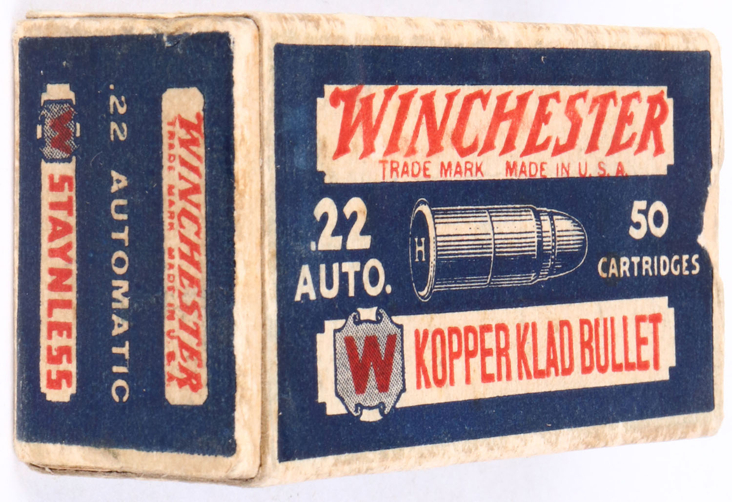 Winchester, Kopper Klad Bullet, .22 Auto., Similar to RHWeb: WRA-12.5 WA-1 (only no end flap warning), Full, 1pc. Blue white & red box, box is solid with excellent color, minor age soiling, very minor corner wear, edges are mostly crisp, end flaps are solid, ammo is excellent. Grade: Excellent + - Value: 30 to 90