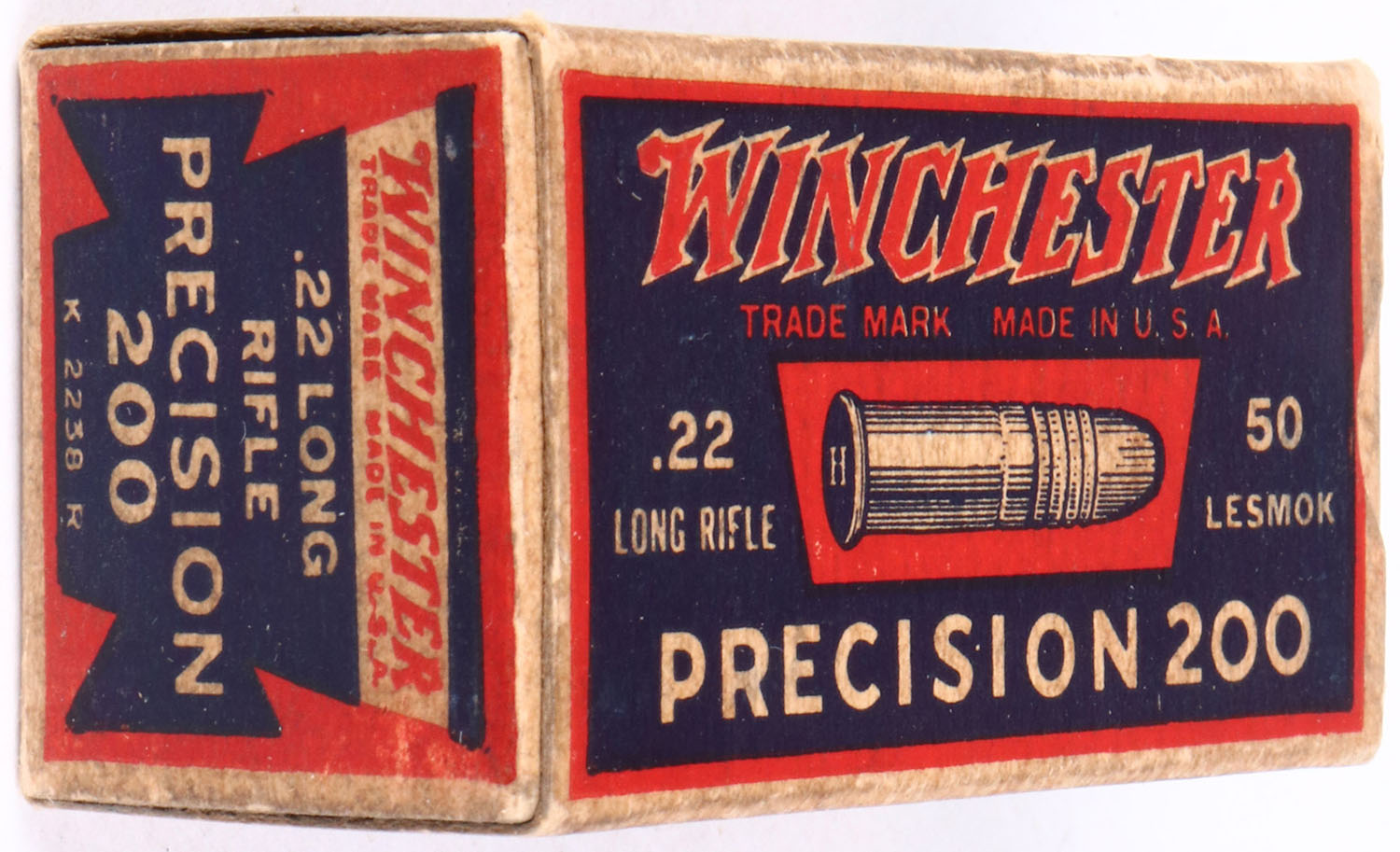 Winchester, Precision 200, .22 Long Rifle, Lesmok, RHWeb: WRA-53 LR-11d, Full, 1pc. Blue red & white box, box is solid with excellent colors, age soiling, very minor edge & corner wear, ammo is excellent. Grade: Excellent + - Value: 50 to 150