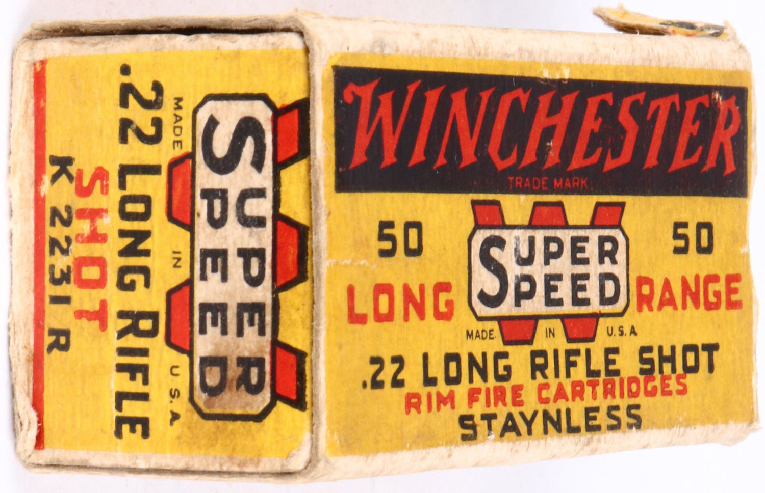 Winchester, Super Speed, .22 Long Rifle Shot, RHWeb: WRA-14A, LR-4b Full, 1pc. Yellow red & black box, box is solid with very good to excellent color, some age soiling, some edge & corner wear, end flaps are solid, ammo is excellent. Grade: Excellent - Value: 100 to 300