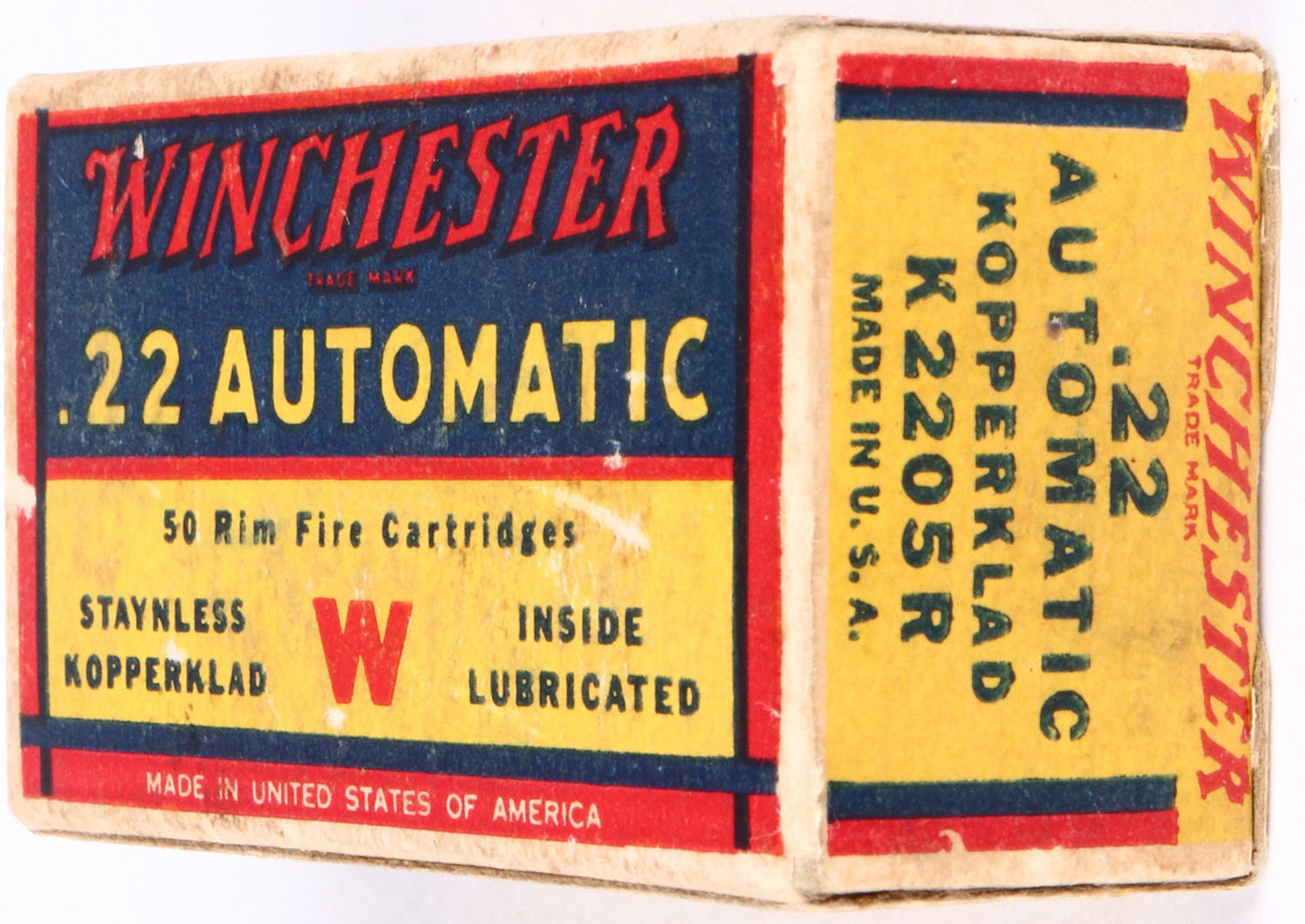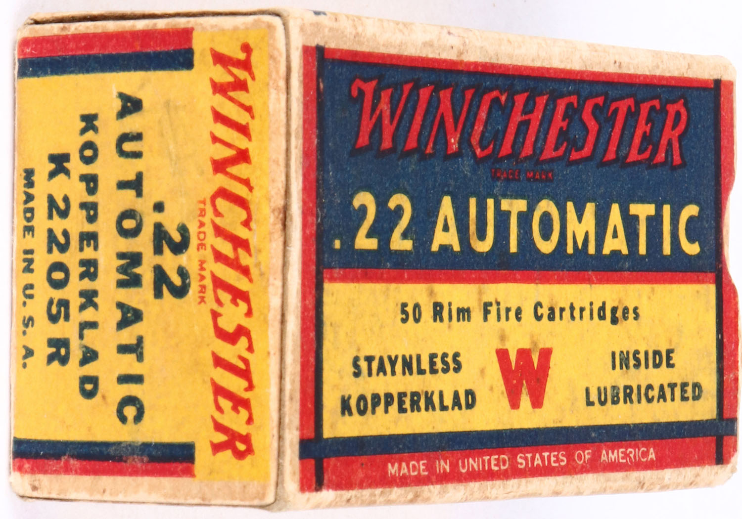 Winchester, .22 Automatic, Staynless Kopperklad, RHWeb: WRA-15 WA-1b, Full, 1pc. Yellow blue & red box, box is solid with very good to excellent color, some age soiling, minor corner wear, very minor edge wear, end flaps are solid, ammo is excellent. Grade: Excellent + - Value: 30 to 90