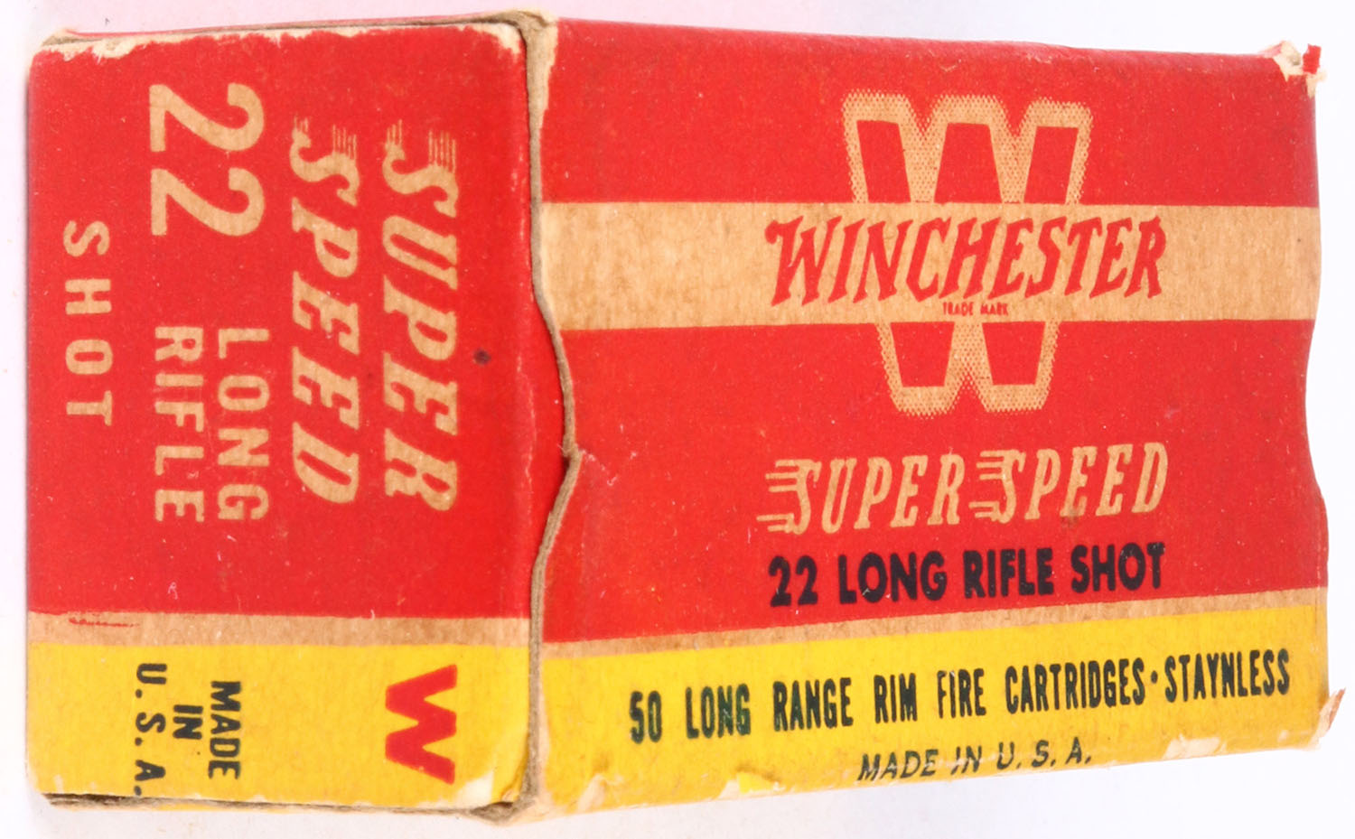 Winchester, Super Speed, .22 Long Rifle Shot, RHWeb: WRA-17 LR-5d, Full, 1pc. Red yellow & white box, box is solid with excellent color, some age soiling & corner wear, edges are mostly crisp, partial seam split to right end flap, left end flap is solid, ammo is excellent. Grade: Very Good ++ - Value: 20 to 60