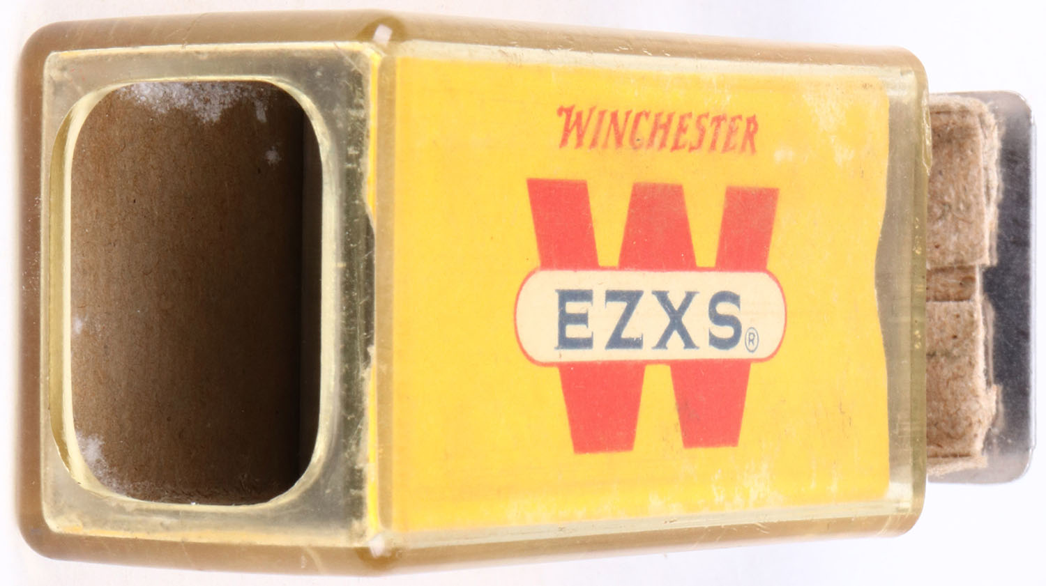 Winchester (inside box), EZXS, .22 Long Rifle, Pistol Match, RHWeb: WRA-54 LR-9, Empty, 1pc. Yellow red & white box inside an O.I.C. Plastic case from the 1940's with a sliding aluminum tray, comes with a copy of an advertisement clipping from Rifleman Magazine, inside box is missing both end flaps, excellent color, some age soiling, edges are crisp, corners are sharp, plastic case is solid with excellent color, some cloudiness to plastic, tray is solid. Grade: Excellent - Value: 6 to 60