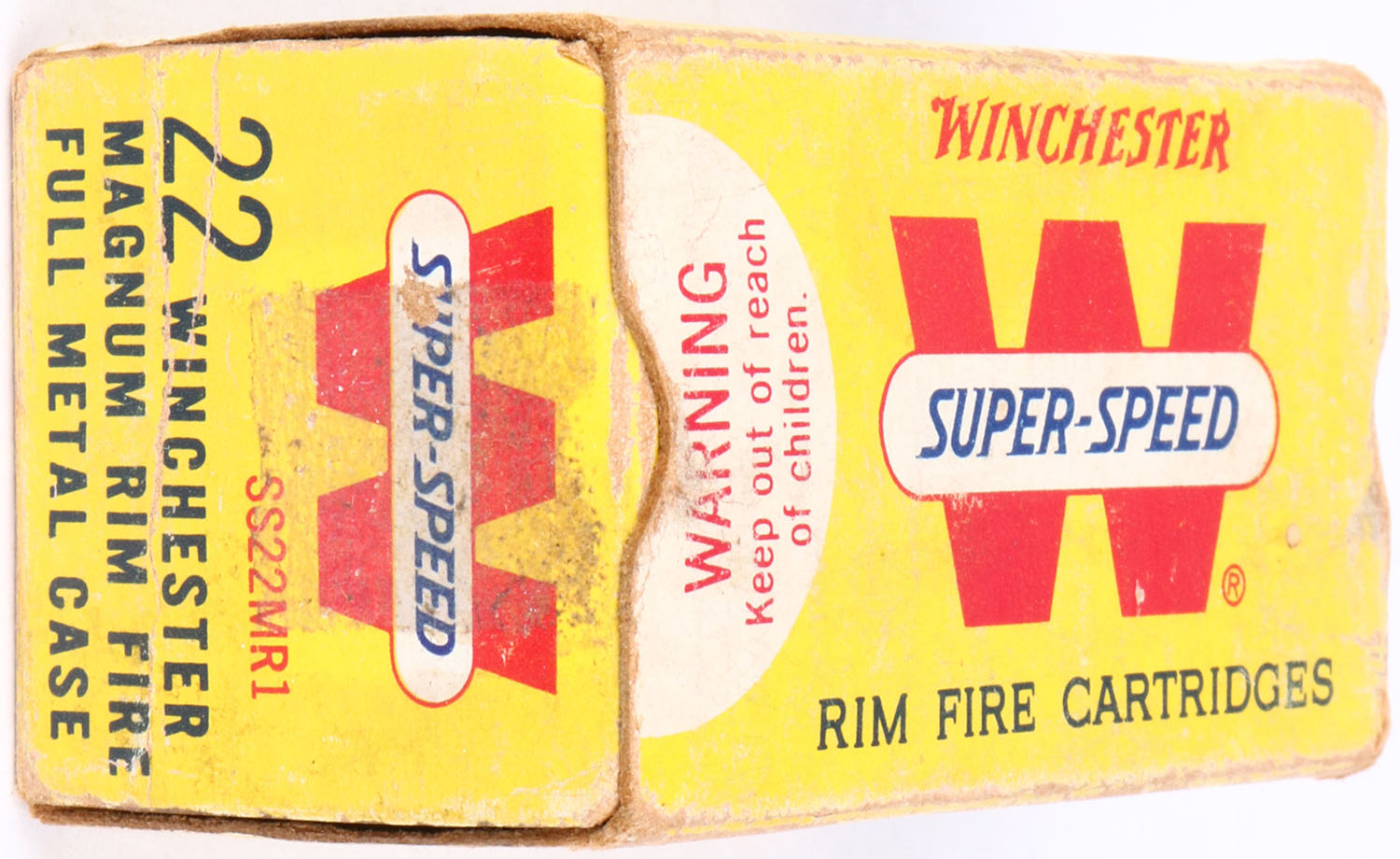 Winchester, Super-Speed, .22 Winchester Magnum Rim Fire, Full Metal Case, RHWeb: WRA-20 WMR-1c, Full, 1pc. Yellow red & white box, box is solid with very good color, some shelf wear, minor age soiling, some edge & corner wear, end flaps are solid, ammo is excellent. Grade: Excellent - Value: 10 to 50