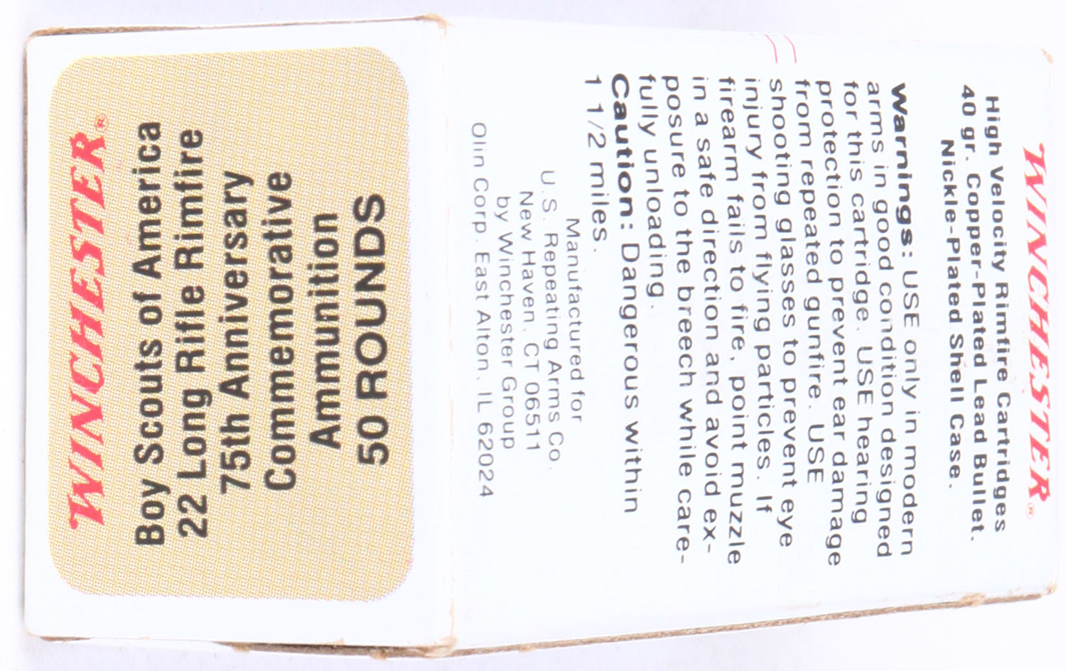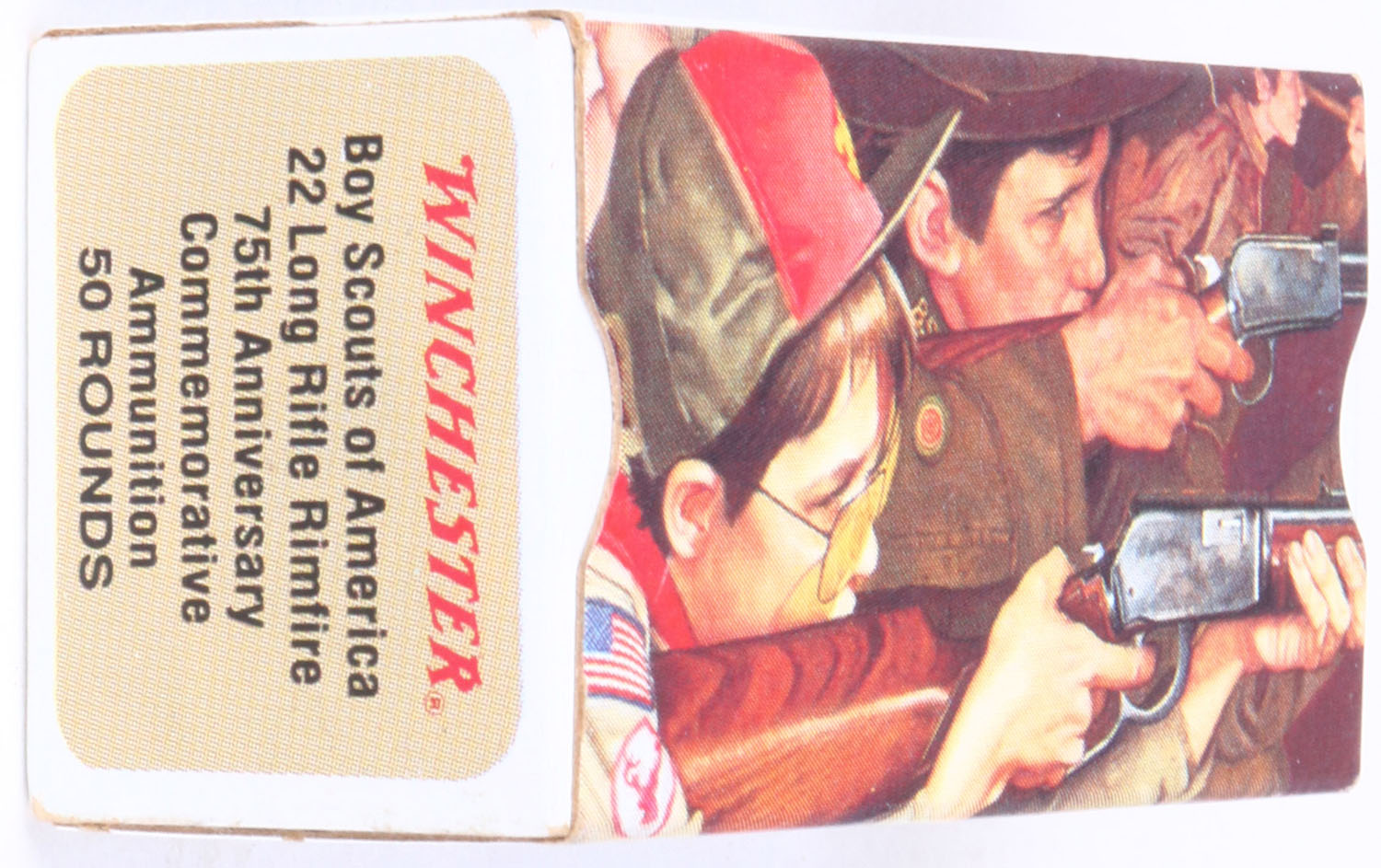 Winchester, Boy Scouts of America 75th Anniversary, .22 Long Rifle, RHWeb: WRA-70 LR-1, Full, 1pc. Multicolored box, box is mint with minty color, sharp corners, crisp edges, rigid end flaps, ammo is minty. Grade: MINT - Value: 10 to 50