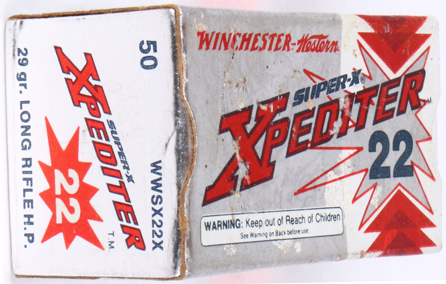 Winchester-Western, Super-X Xpediter, .22 Long Rifle Hollow Point, Xtra High Velocity, RHWeb: WW-1 LR-11b, Full, 1pc. Silver red & white box, box is solid with excellent color, some scuffing to top, corners are mostly sharp, edges are crisp, end flaps are solid, ammo is excellent. Grade: Excellent - Value: 8 to 40