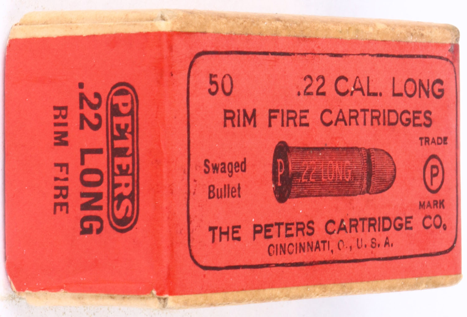 Peters, Rim Fire Cartridges, .22 Long, Swaged Bullet, RHWeb: PCC-4 L-1d, FULL & SEALED, 2pc. Buff box with red wraparound label, box is solid with excellent color, minor staining to front and back sides, corners are mostly sharp, edges are crisp, label is intact. Grade: Excellent + - Value: 10 to 50