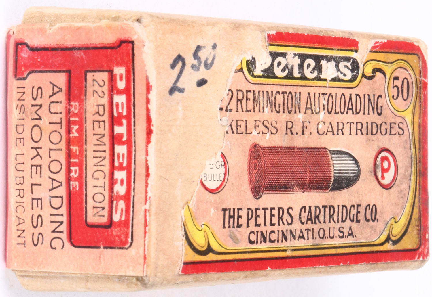 Peters, .22 Remington Autoloading, Smokeless, RHWeb: PCC-5A RA-1, FULL & SEALED, 2pc. Buff box with salmon & red wraparound label, box is solid with very good color, some age soiling, tear to top label, top has been written on, minor corner wear, very minor edge wear, label is 95% intact. Grade: Very Good ++ - Value: 50 to 150