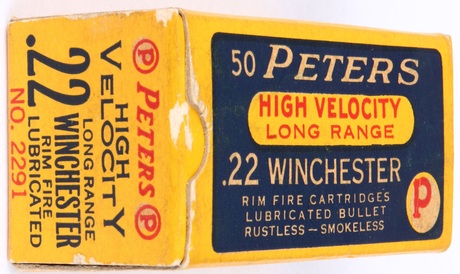 Peters, High Velocity Long Range, .22 Winchester Rim Fire, RHWeb: PCC-11B WRF-1, Full, 1pc. Yellow blue & red box, box is solid with very good to excellent color, very minor age soiling, very minor edge & corner wear, end flaps are solid, ammo is minty. Grade: Excellent + - Value: 20 to 60