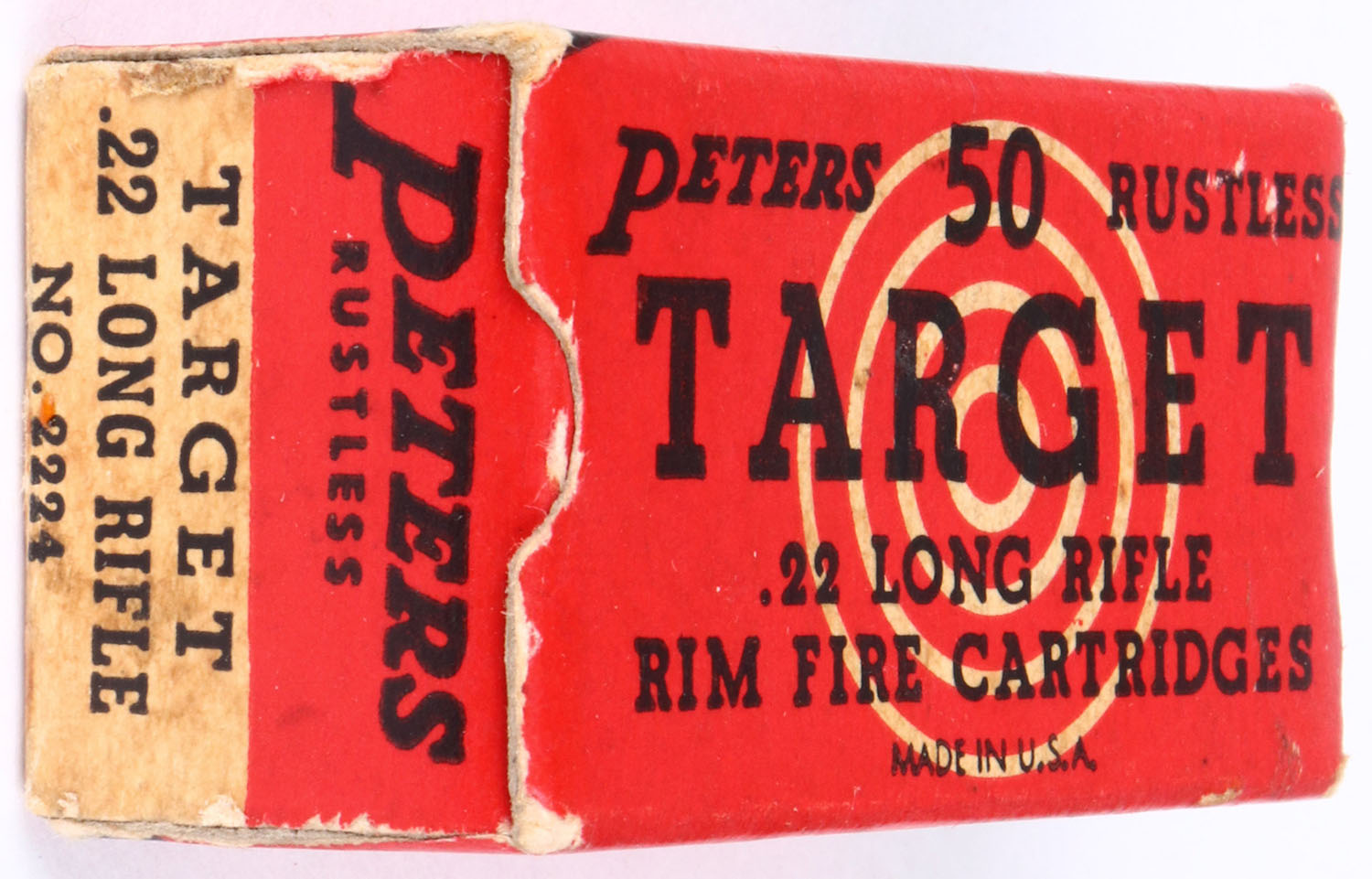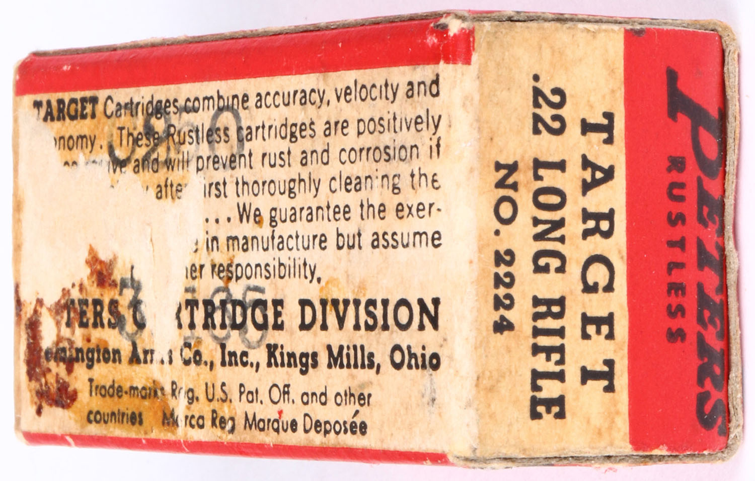 Peters, Target, .22 Long Rifle, RHWeb: PCC-54A LR-1h, Full, 1pc. Red black & white box, box is solid with excellent color, very minor age soiling, bottom is stained and scuffed, some corner wear, edges are mostly crisp, end flaps are solid, ammo is excellent. Grade: Excellent - Value: 10 to 50
