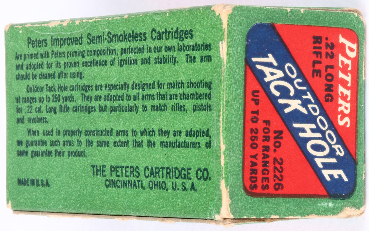 Peters, Outdoor Tack Hole, .22 Long Rifle, Improved Semi-Smokeless, RHWeb: PCC-52 LR-9, Full, 1pc. Red green & blue box, box is solid with excellent to minty color, very minor edge & corner wear, end flaps are solid, ammo is very good. Grade: Excellent ++ - Value: 100 to 200