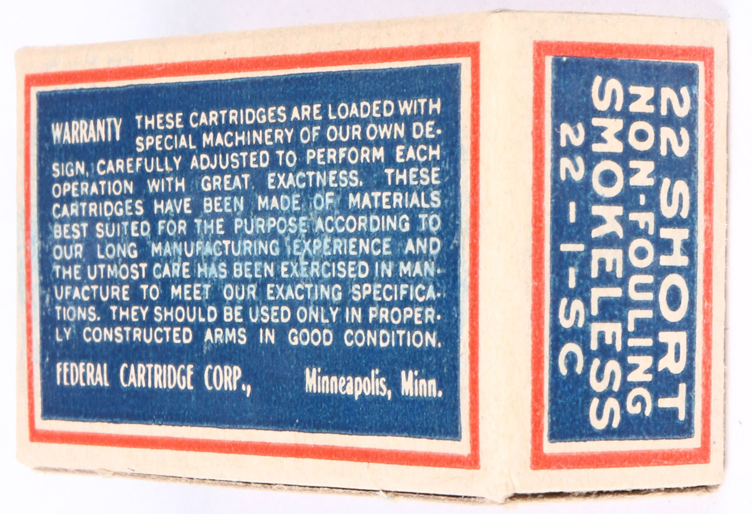 Federal, Non-Fouling, .22 Short, Copper Coated, RHWeb: FCC-3 S-2c, Full, 1pc. Blue red & white box, box is near mint with excellent to minty color, only very minor age soiling & shelf wear, corners are sharp, edges are crisp, end flaps are solid, ammo is excellent. Grade: MINT - Value: 50 to 250