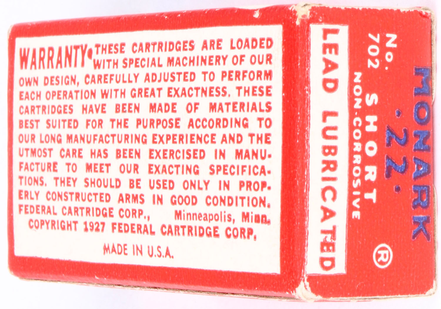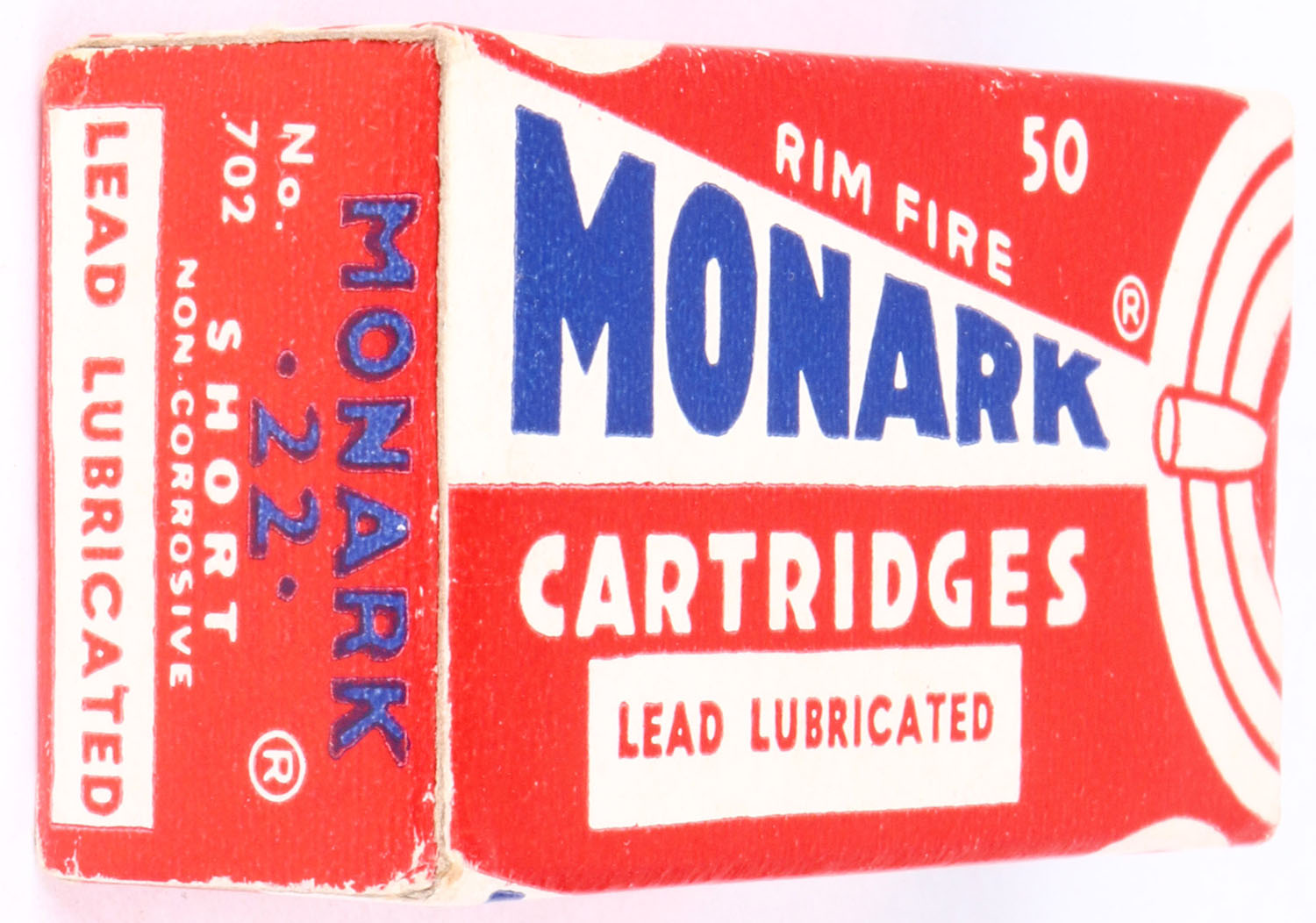 Federal, Monark, .22 Short, RHWeb: FED-5 S-4, Full, 1pc. Red white & blue box, box is near mint with minty color, only very minor corner wear, edges are crisp, end flaps are solid, ammo is excellent. Grade: Excellent ++ - Value: 10 to 50