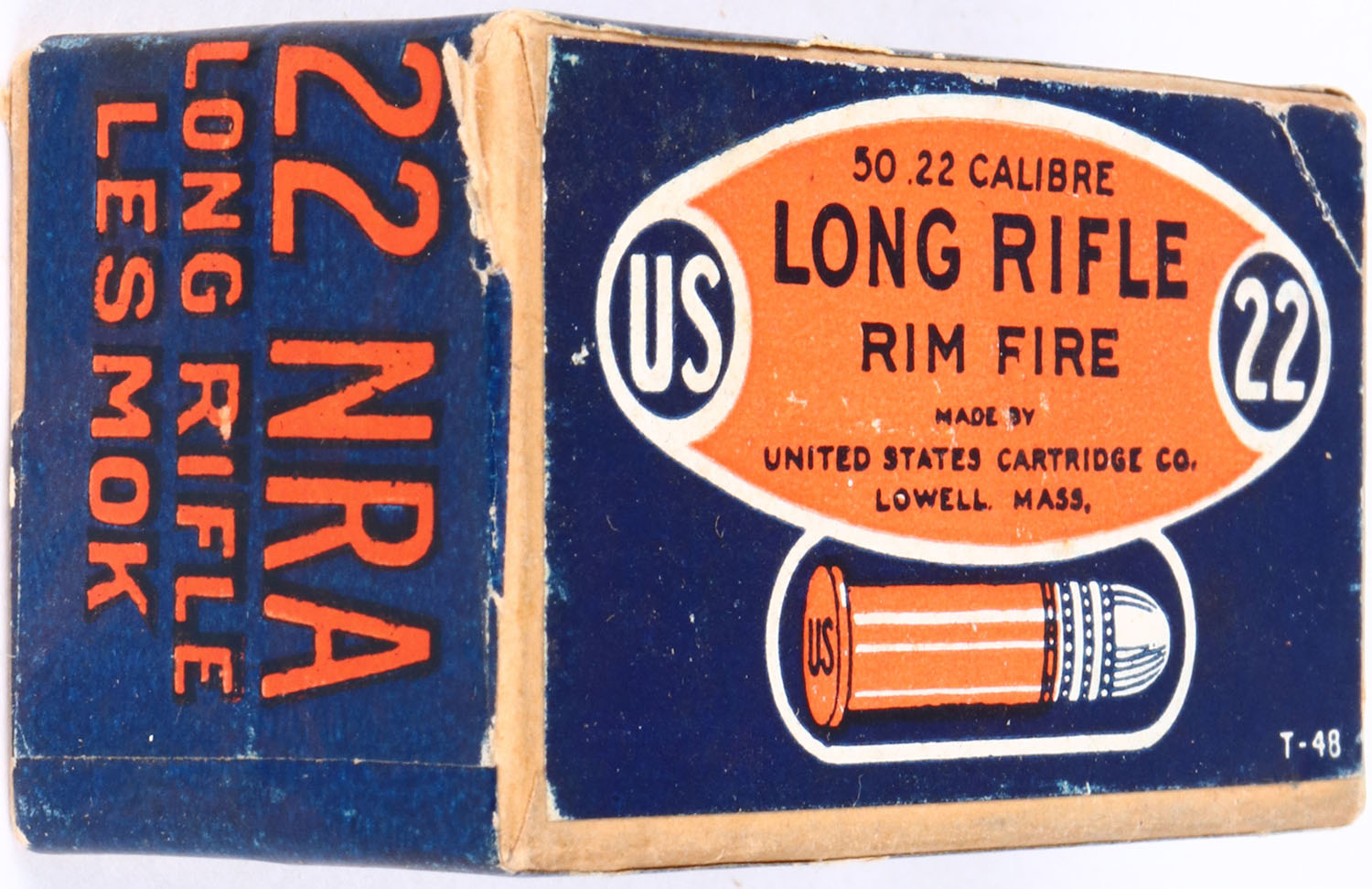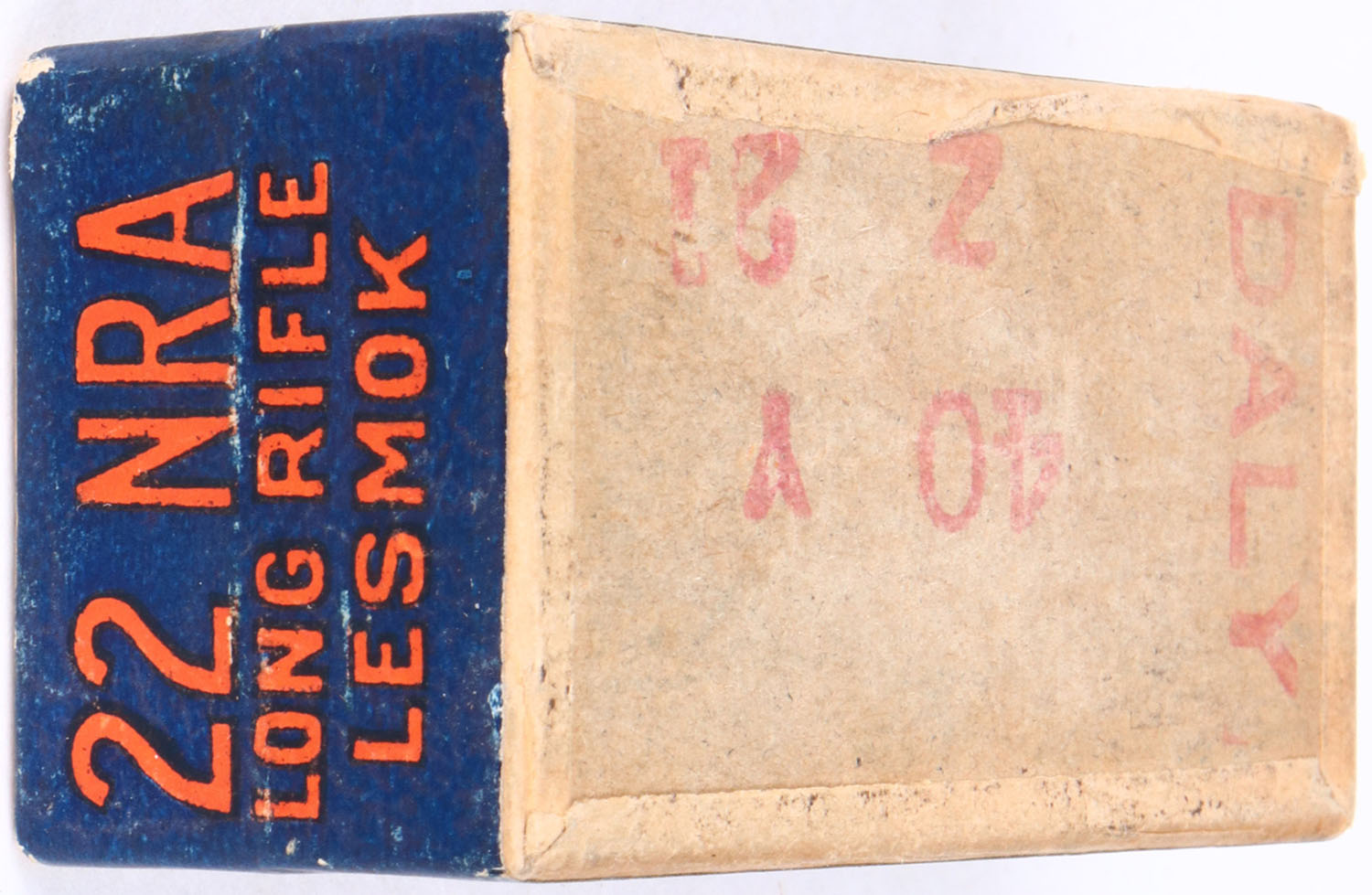 U.S., 22 NRA, .22 Long Rifle, Lesmok, RHWeb: US-51 LR-5, FULL & SEALED, 2pc. Buff box with blue & orange top & side sealing labels, box is solid with excellent to minty color, very minor edge & corner wear, labels are intact. Grade: Excellent + - Value: 20 to 100