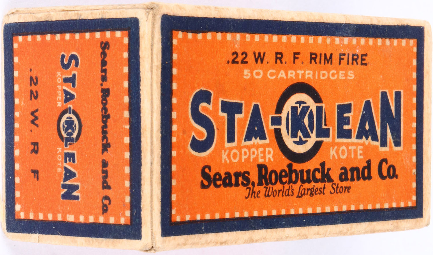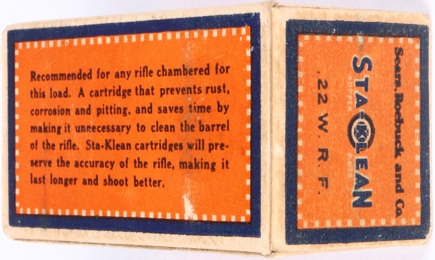 Sears, Sta-Klean, .22 W.R.F., Kopper Kote, RHWeb: SEARS-3 WRF-1a, Full, 1pc. Orange blue & buff box, box is solid with excellent color, minor age soiling, very minor corner wear, edges are mostly crisp, end flaps are solid, ammo is excellent to minty. Grade: Excellent + - Value: 20 to 60