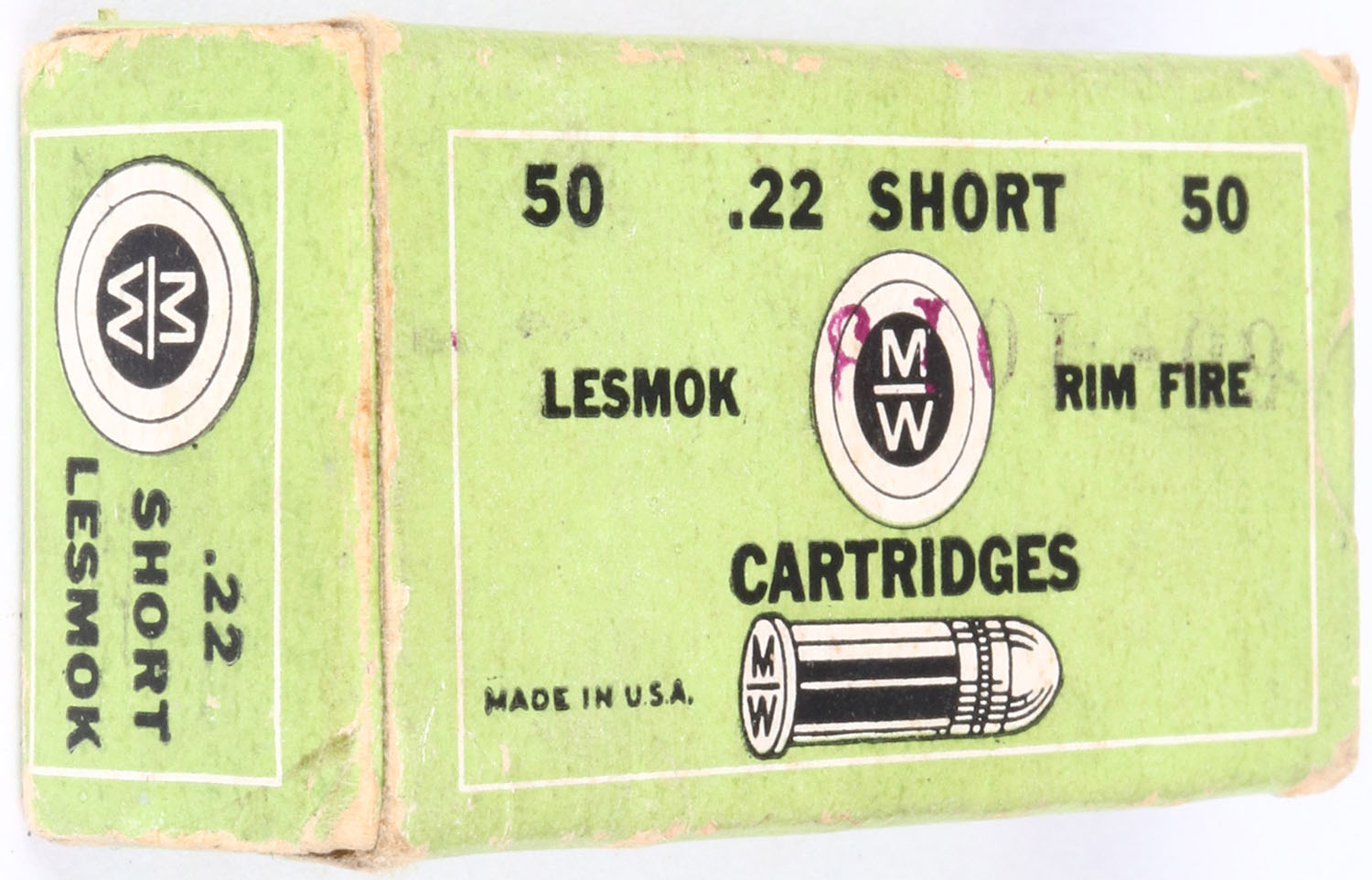Wards, Lesmok Rim Fire Cartridges, .22 Short, RHWeb: MW-1 S-2a, Full, 1pc. Green black & white box, box is solid with excellent color, very minor age soiling & edge wear, minor corner wear, end flaps are solid, ammo is good to very good. Grade: Excellent + - Value: 100 to 300