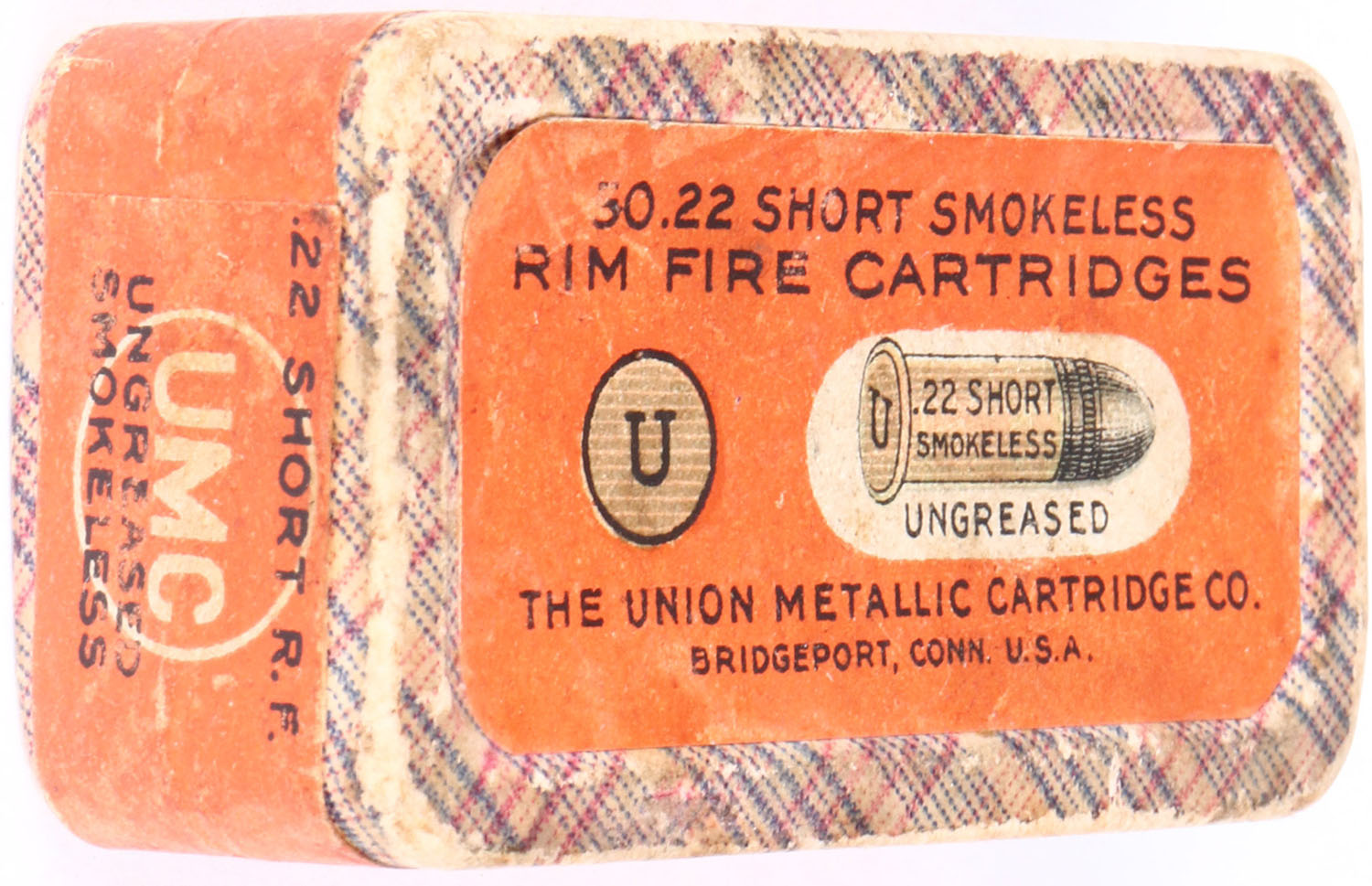 UMC, Rim Fire Cartridges, .22 Short, Smokeless Ungreased, RHWeb: UMC-9.5 S-6, FULL & SEALED, 2pc. Purple fabric box with orange top & side sealing labels, box is solid with very good to excellent color, some age soiling & shelf wear, some edge & corner wear, labels are intact. Grade: Excellent - Value: 50 to 150
