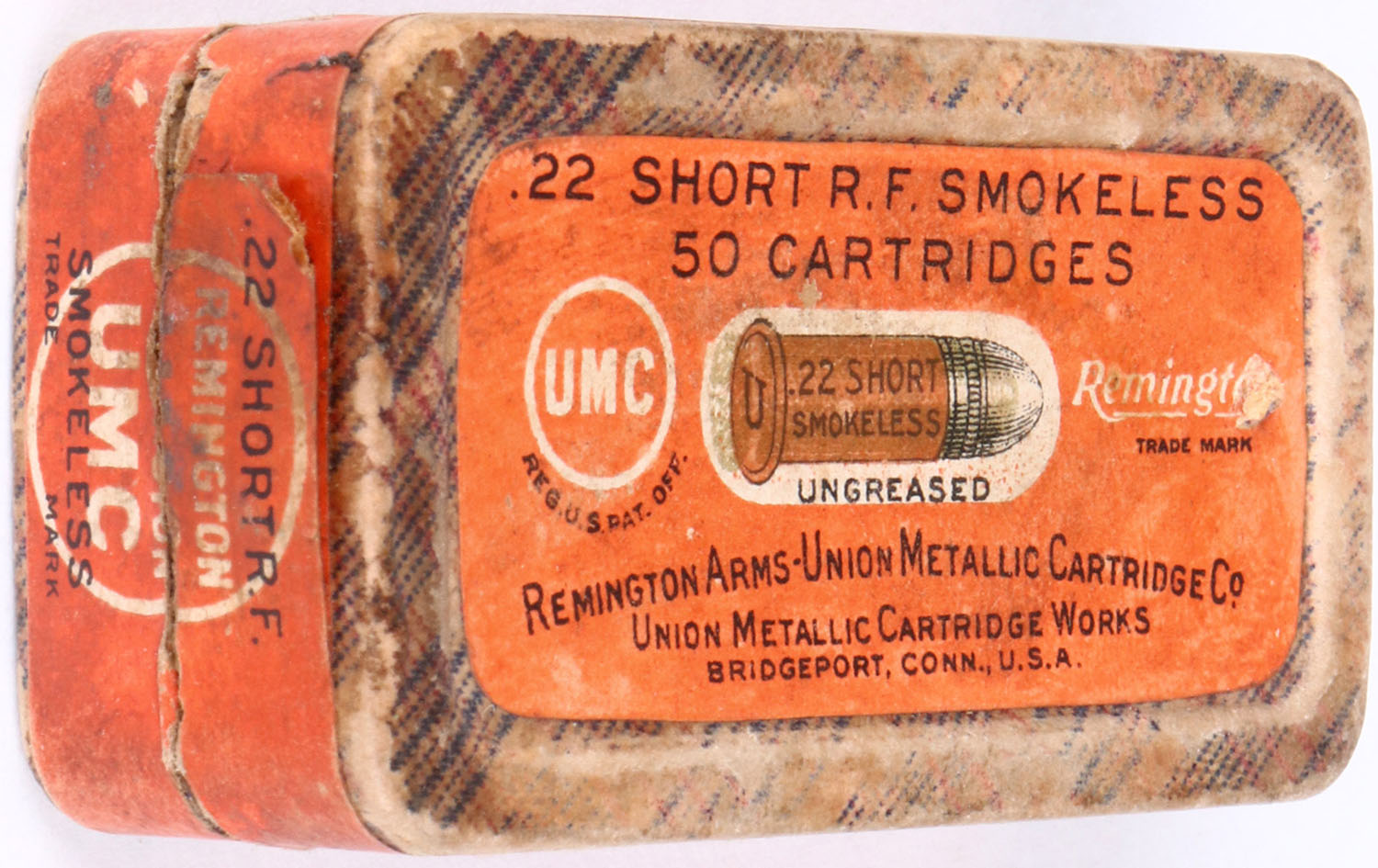 REM-UMC, .22 Short, Smokeless Ungreased, RHWeb: REM-1 S-4A, Full, 1pc. Purple fabric box with orange top & side sealing labels, box is solid with very good to excellent color, minor age soiling, shelf wear, very minor edge & corner wear, some peeling to side sealing label on left end, labels are intact, ammo is fair to good. Grade: Excellent - Value: 40 to 200