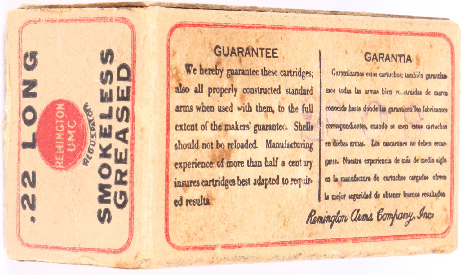 REM-UMC, .22 Long, Smokeless Greased, RHWeb: REM-6 L-6, Full, 1pc. Buff black & red box, box is solid with excellent color, very minor age soiling, minor corner wear, very minor edge wear, end flaps are solid, ammo is very good. Grade: Excellent - Value: 10 to 50