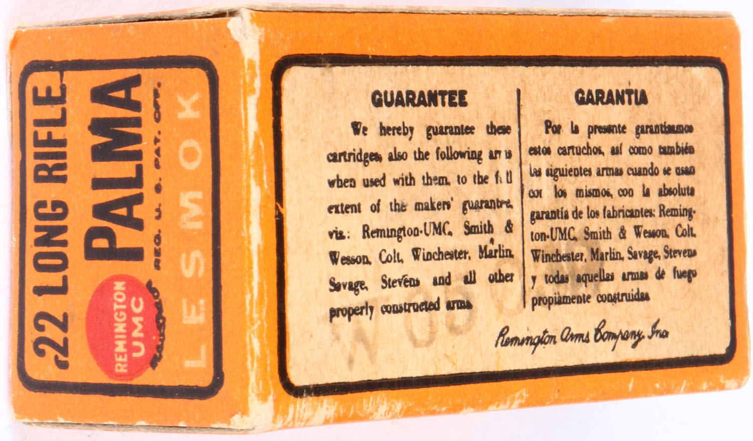 REM-UMC, Palma, .22 Long Rifle, Lesmok, RHWeb: REM-52 LR-1b, Full, 1pc. Orange black & red box, box is solid with excellent to minty color, only very minor age soiling on bottom and very minor corner wear, edges are crisp, end flaps are solid, ammo is excellent. Grade: Excellent ++ - Value: 20 to 60