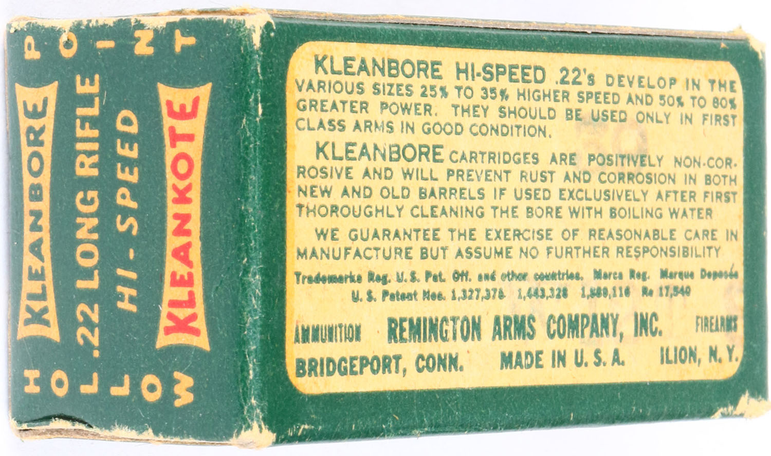 Remington, Kleanbore Kleankote, .22 Long Rifle, Hi-Speed, RHWeb: REM-9 LR-2a, Full, 1pc. Green white & red box, box is solid with excellent color, minor age soiling, very minor corner wear, edges are crisp, end flaps are solid, ammo is excellent. Grade: Excellent + - Value: 20 to 60