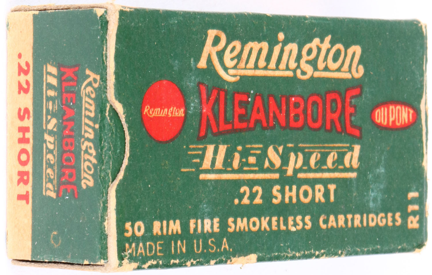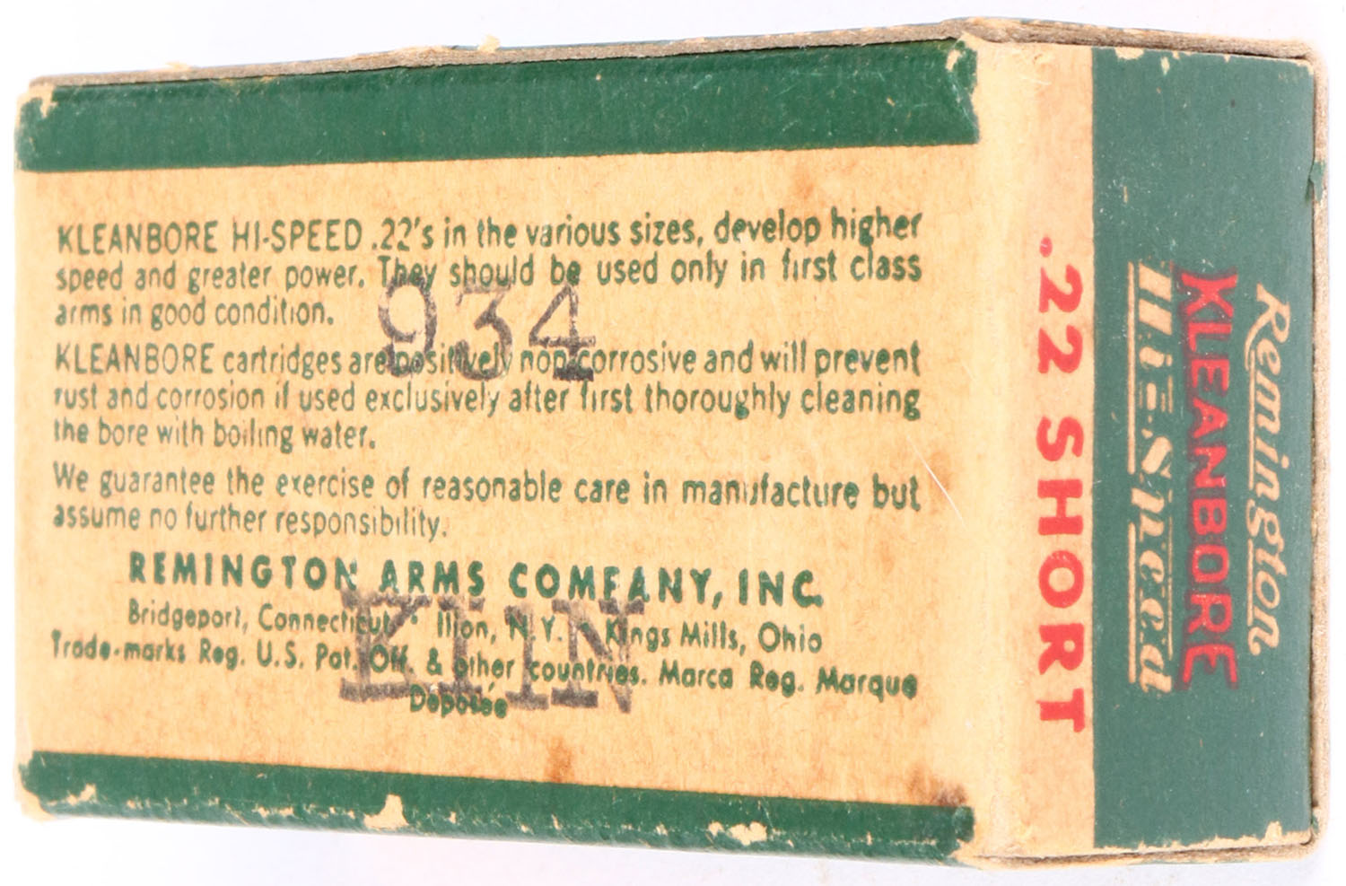 Remington, Kleanbore Hi-Speed, .22 Short, RHWeb: REM-10 S-1a, Full, 1pc. Green white & red box, box is solid with very good to excellent color, some age soiling, minor edge & corner wear, end flaps are solid, ammo is excellent. Grade: Excellent - Value: 6 to 30
