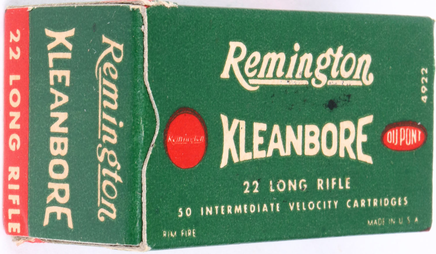 Remington, Kleanbore, .22 Long Rifle, Intermediate Velocity, RHWeb: REM-13 LR-2, Full, 1pc. Green white & red box, box is solid with excellent to minty color, small stain on top, corners are mostly sharp, edges are crisp, end flaps are solid, ammo is excellent. Grade: Excellent ++ - Value: 10 to 50