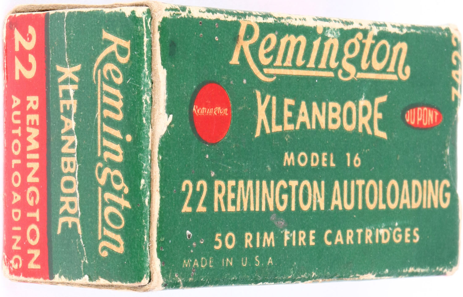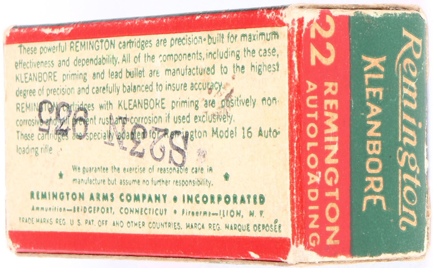 Remington, Kleanbore, .22 Remington Autoloading, RHWeb: REM-12 RA-1b, Full, 1pc. Green white & red box, box is solid with excellent color, some age soiling, some edge & corner wear, end flaps are solid, ammo is excellent. Grade: Excellent - Value: 50 to 150
